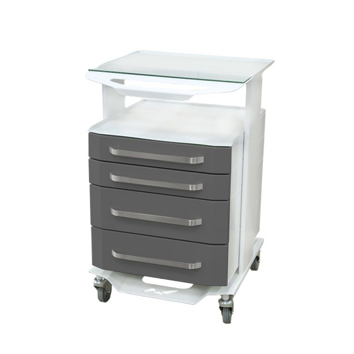 Стол тумба СИПС-Н-01 – современная и эргономичная тумба, отлично впишется в любой кабинет за счет различных вариантов цветового исполнения. Передвижная тумба имеет четыре ящика на опоре, сверху металлическая полка со стеклом. Опора имеет четыре колеса из серой резины по 75 мм.