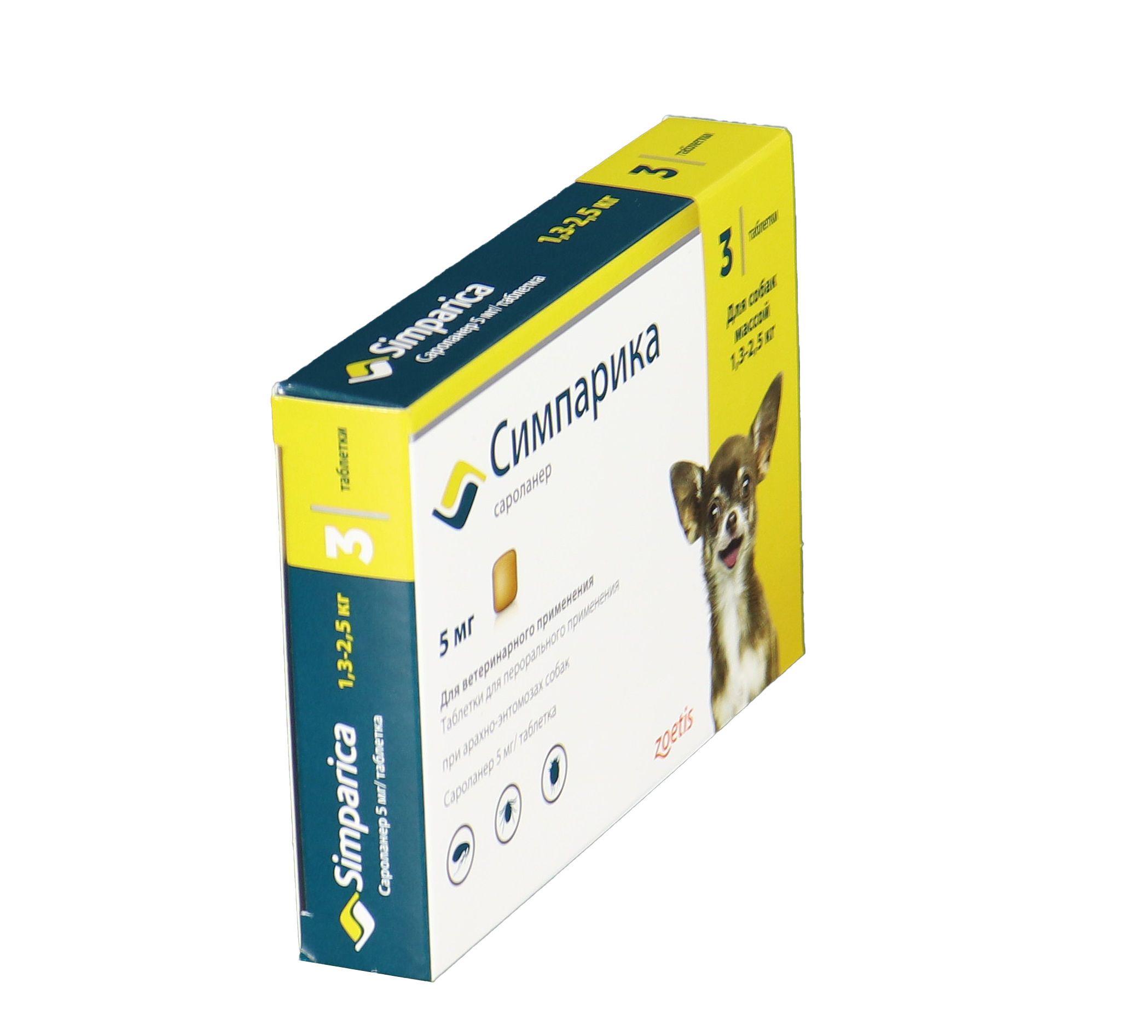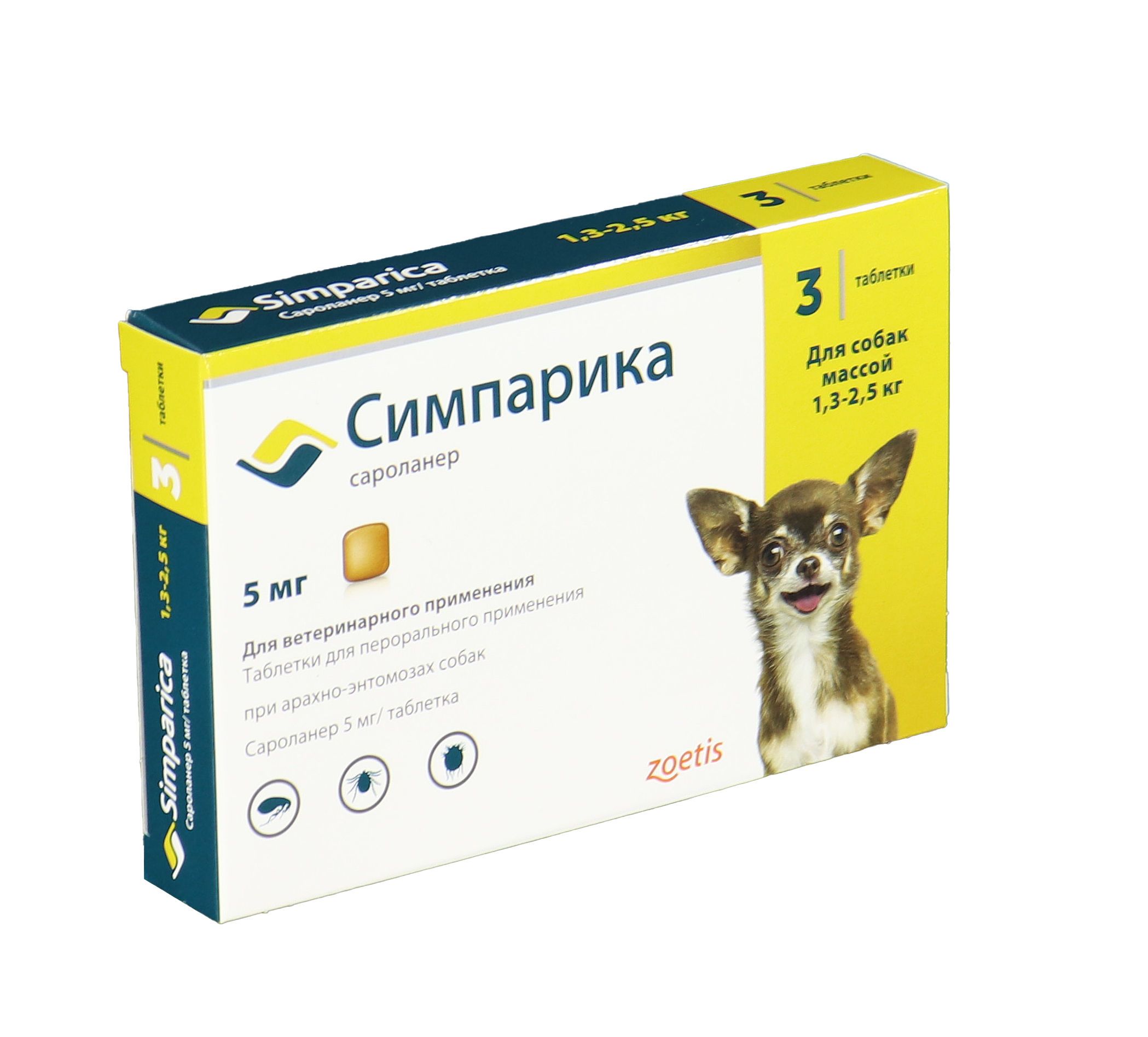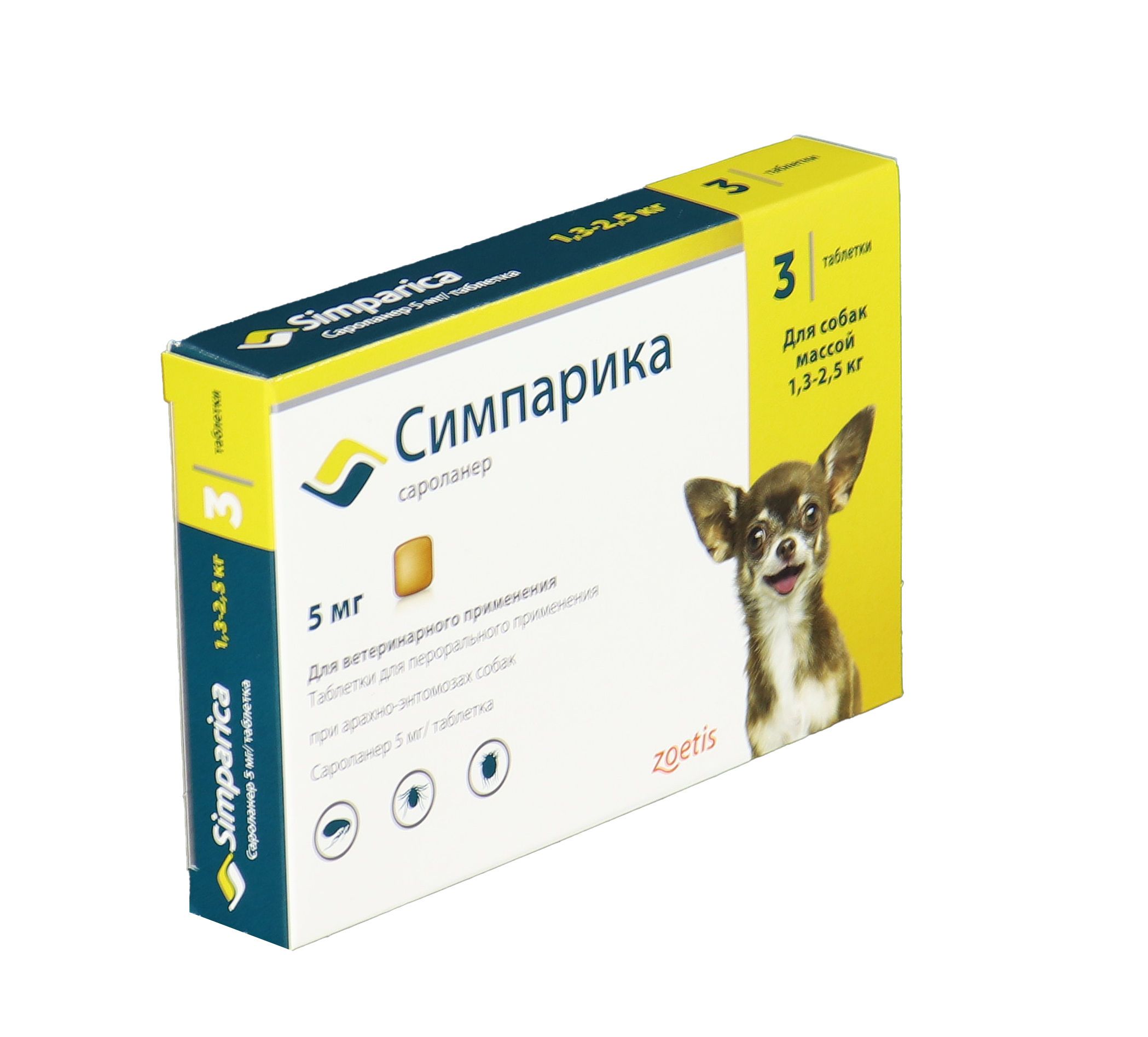 Zoetis Симпарика - жевательные таблетки от блох и клещей для собак весом от 1,3-2,5кг. Уже через 12 часов после дачи таблетки ваша собака будет защищена от 9 видов иксодовых клещей, блох, ушного клеща (отодектоза), чесотки (саркоптоза) и демодекоза. Собака может гулять под дождем, купаться в водоеме и ванне, действие препарата не снижается, и собака остается под надежной защитой! Размер таблетки подобран под размер вашей собаки. Большинство собак едят Симпарику сами. Симпарику удобно давать - В любое удобное для вас время не зависимо от приема пищи.
