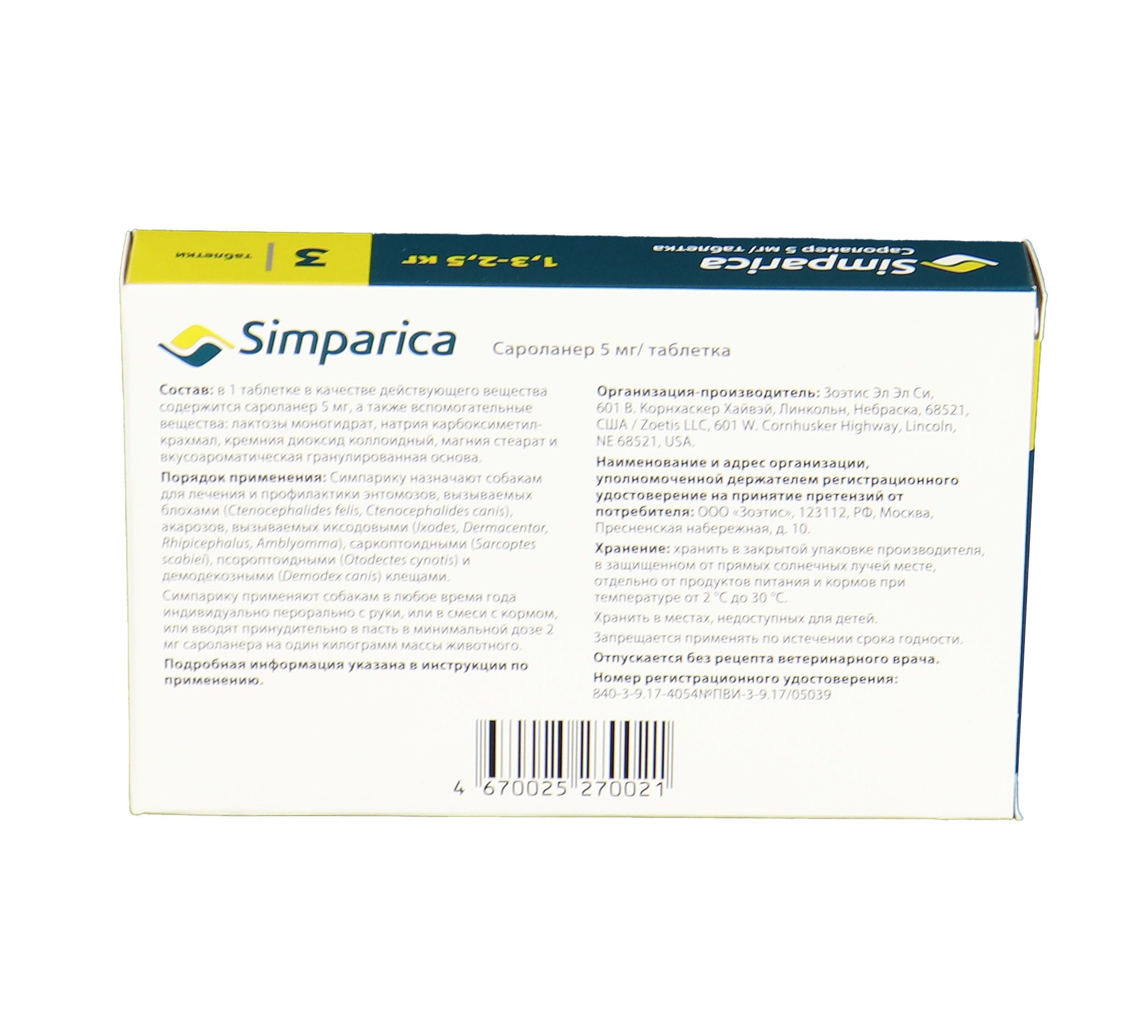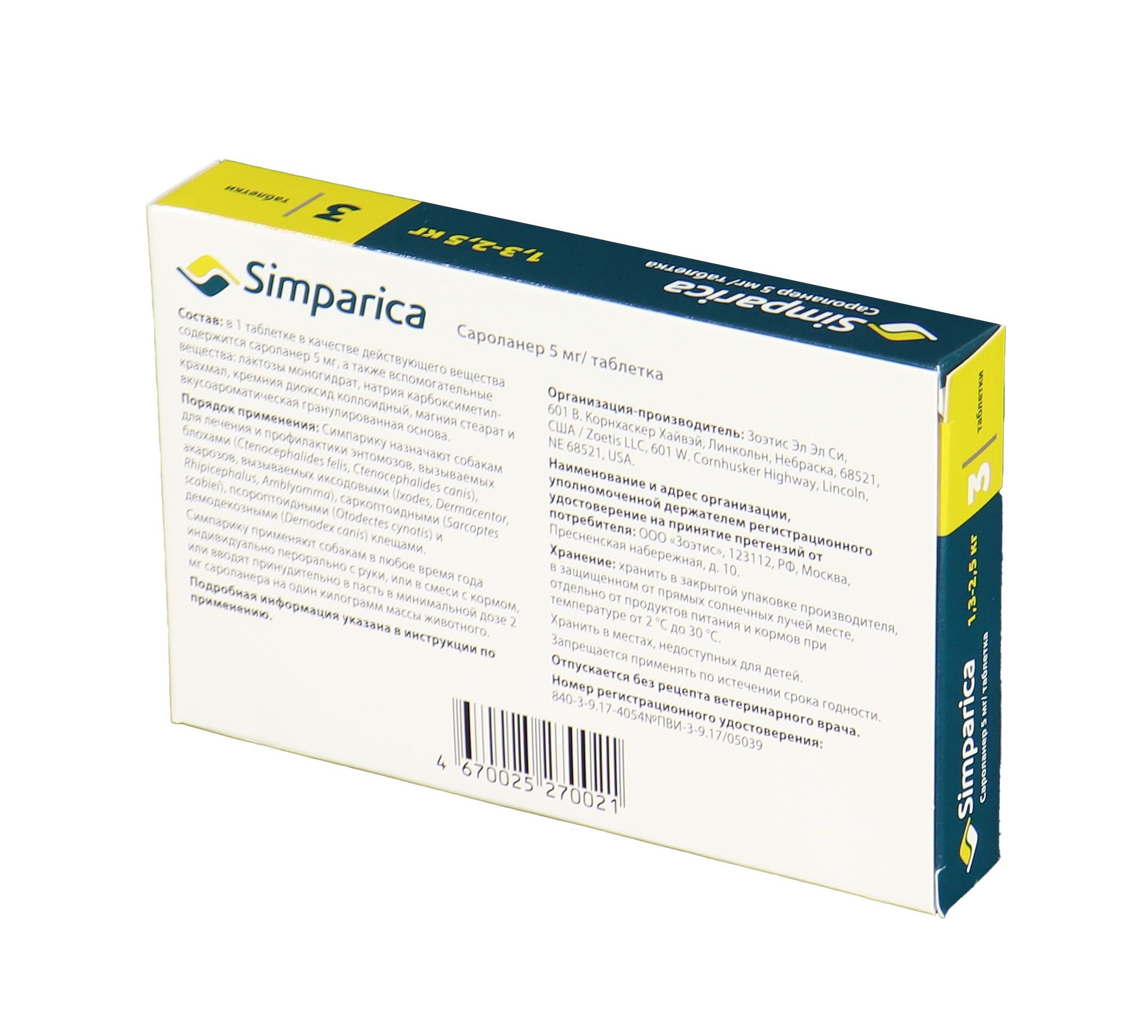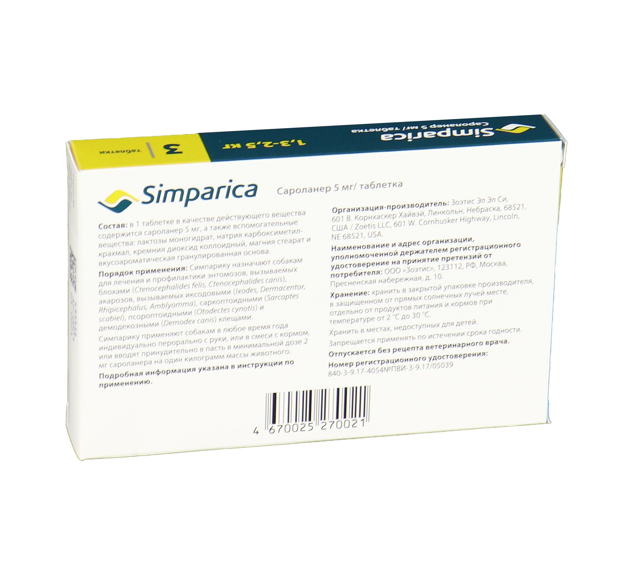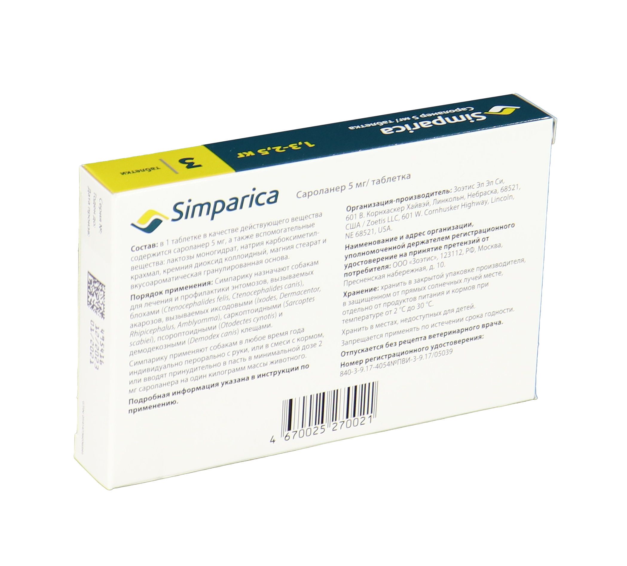 Zoetis Симпарика - жевательные таблетки от блох и клещей для собак весом от 1,3-2,5кг. Уже через 12 часов после дачи таблетки ваша собака будет защищена от 9 видов иксодовых клещей, блох, ушного клеща (отодектоза), чесотки (саркоптоза) и демодекоза. Собака может гулять под дождем, купаться в водоеме и ванне, действие препарата не снижается, и собака остается под надежной защитой! Размер таблетки подобран под размер вашей собаки. Большинство собак едят Симпарику сами. Симпарику удобно давать - В любое удобное для вас время не зависимо от приема пищи.