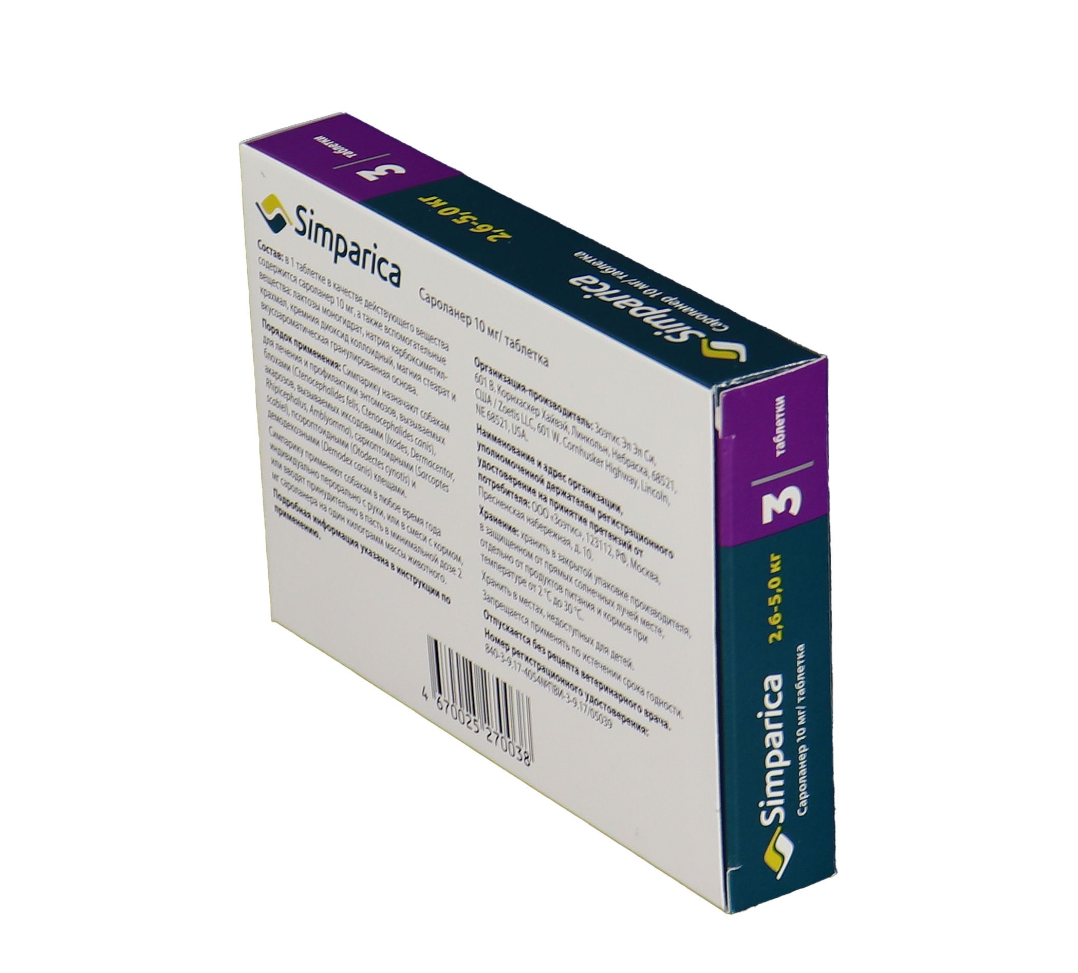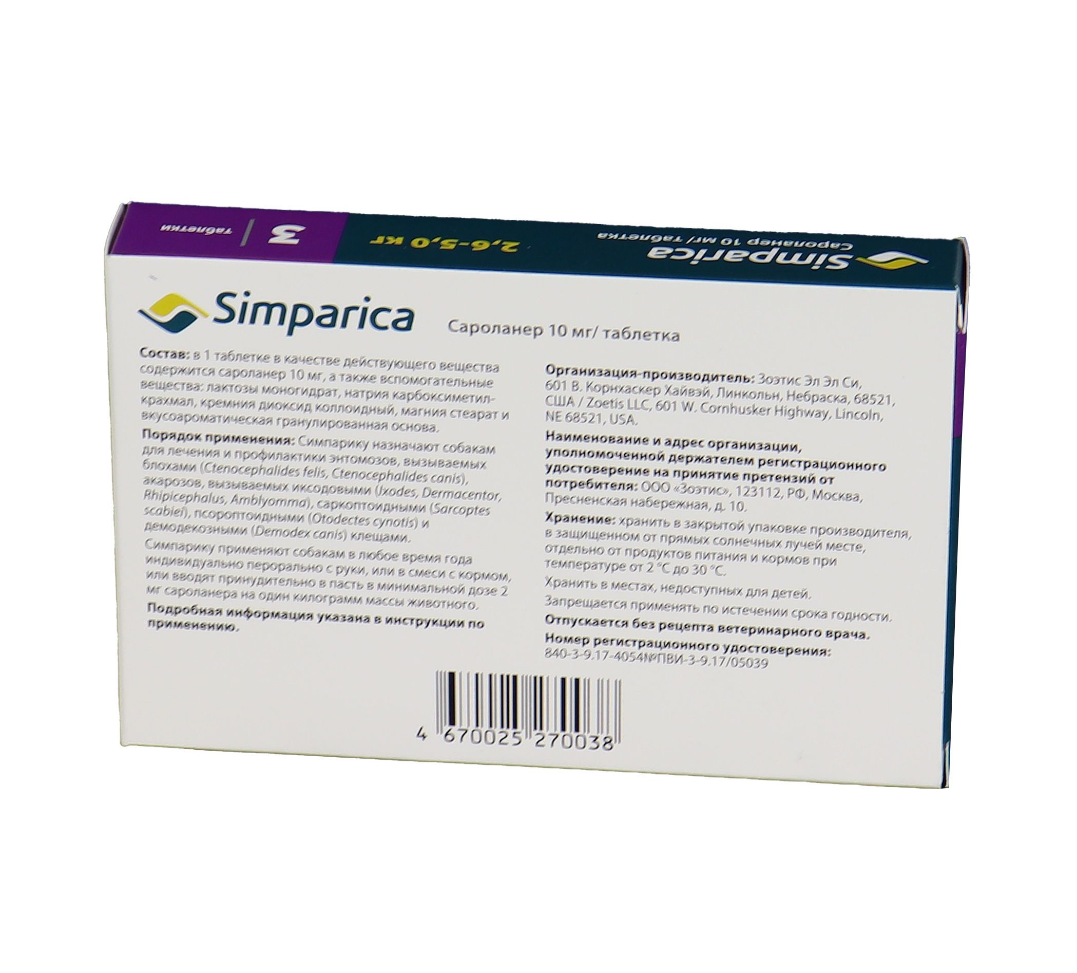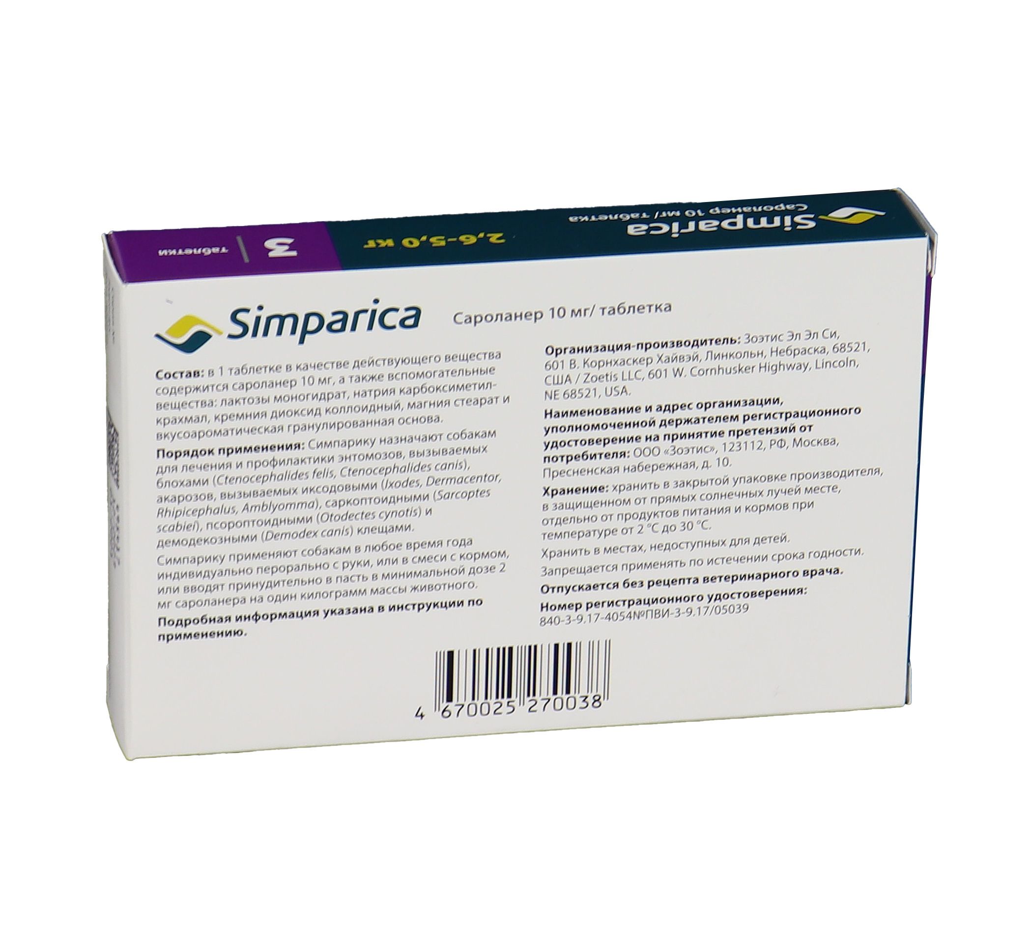 Zoetis Симпарика - жевательные таблетки от блох и клещей для собак весом от 2,6-5 кг. Уже через 12 часов после дачи таблетки ваша собака будет защищена от 9 видов иксодовых клещей, блох, ушного клеща (отодектоза), чесотки (саркоптоза) и демодекоза. Собака может гулять под дождем, купаться в водоеме и ванне, действие препарата не снижается, и собака остается под надежной защитой! Размер таблетки подобран под размер вашей собаки. Большинство собак едят Симпарику сами. Симпарику удобно давать - В любое удобное для вас время не зависимо от приема пищи.