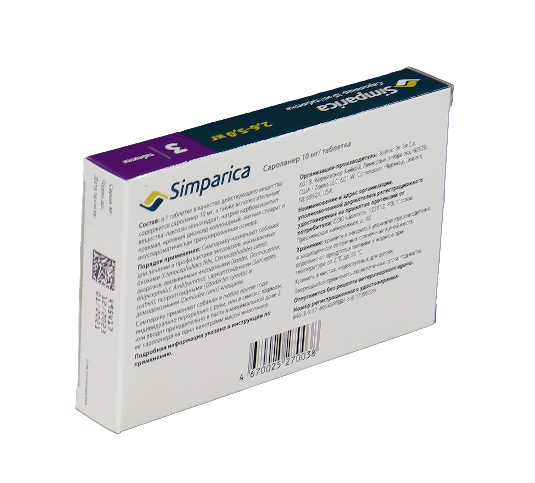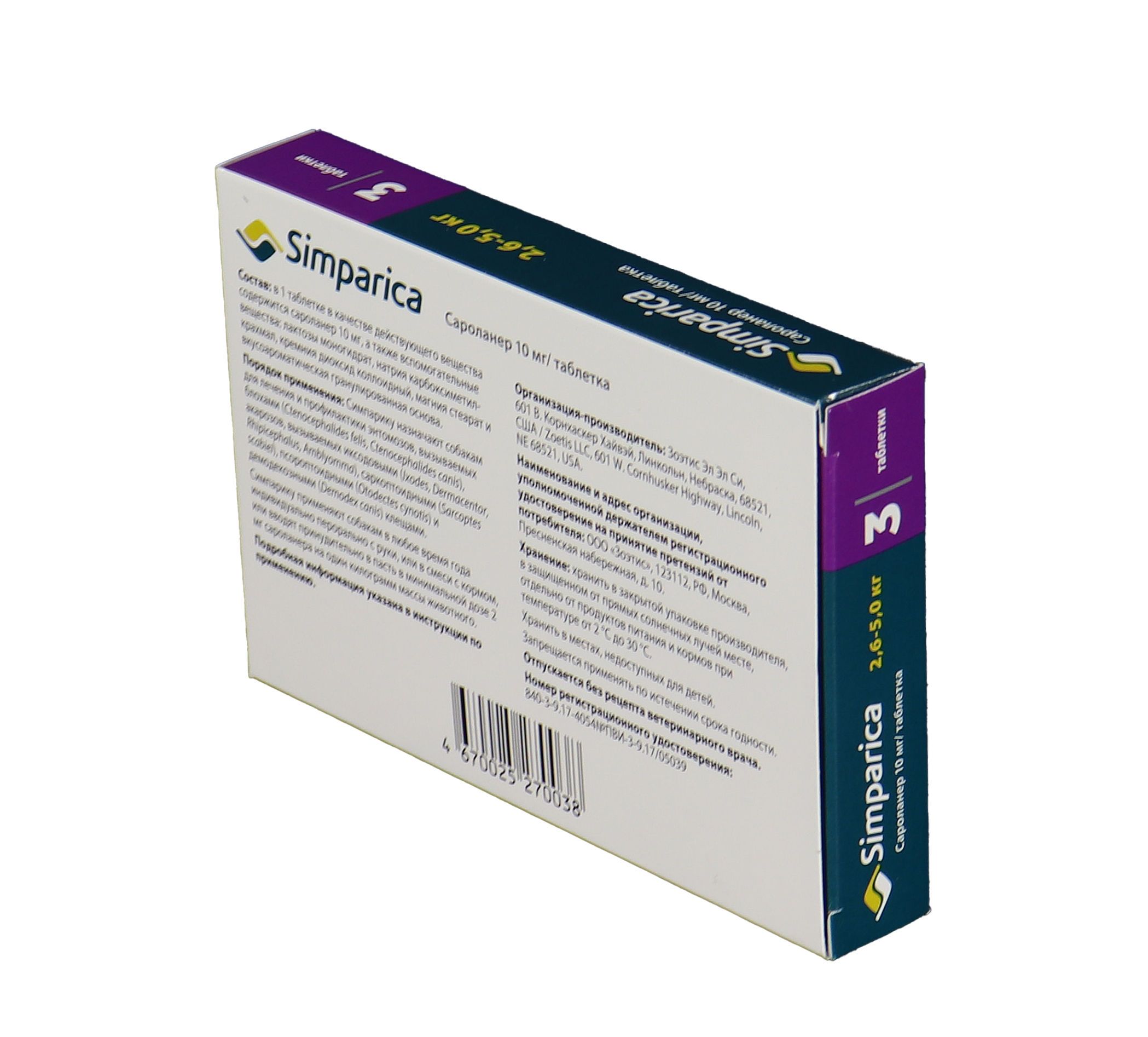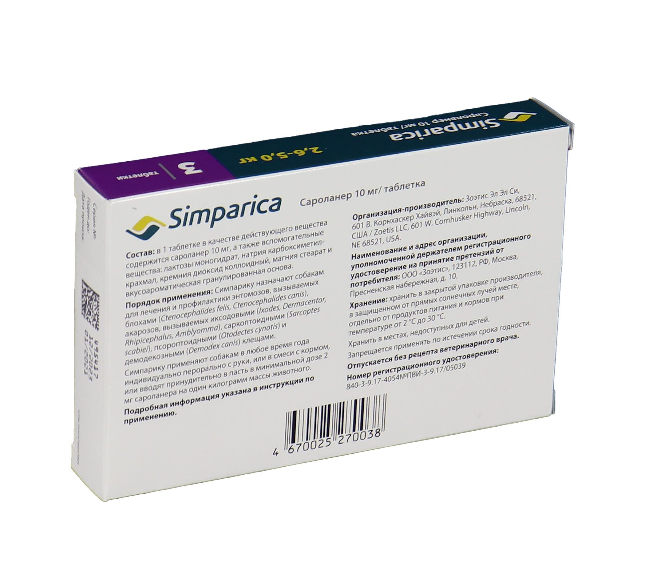 Zoetis Симпарика - жевательные таблетки от блох и клещей для собак весом от 2,6-5 кг. Уже через 12 часов после дачи таблетки ваша собака будет защищена от 9 видов иксодовых клещей, блох, ушного клеща (отодектоза), чесотки (саркоптоза) и демодекоза. Собака может гулять под дождем, купаться в водоеме и ванне, действие препарата не снижается, и собака остается под надежной защитой! Размер таблетки подобран под размер вашей собаки. Большинство собак едят Симпарику сами. Симпарику удобно давать - В любое удобное для вас время не зависимо от приема пищи.