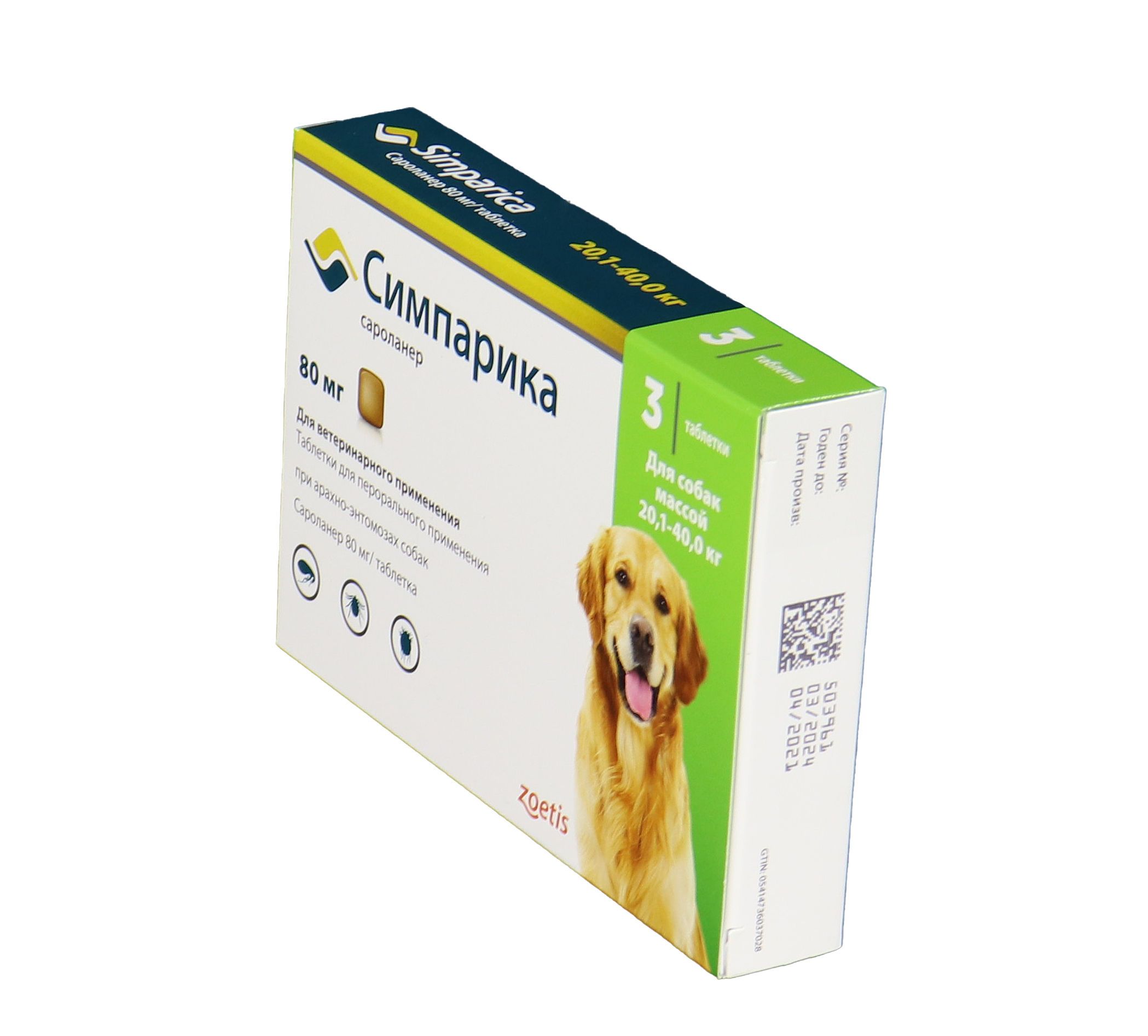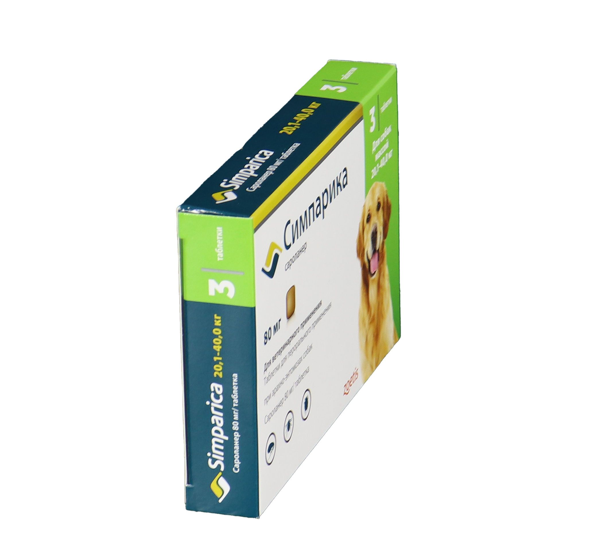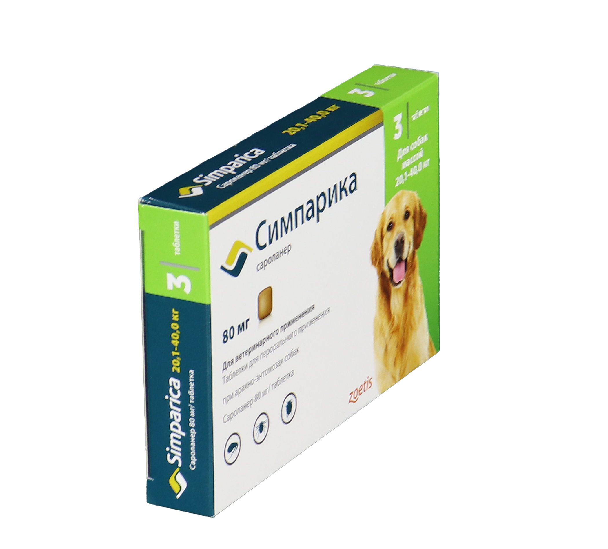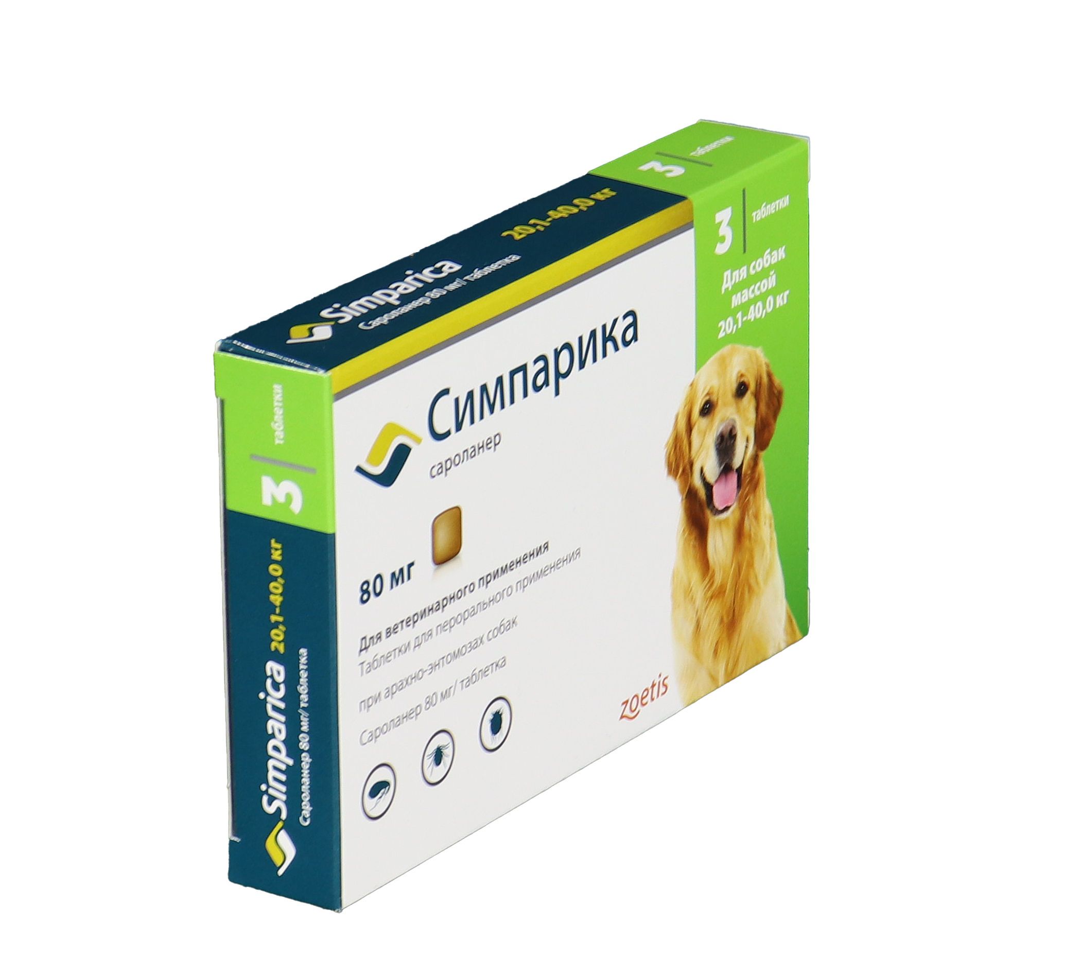 Zoetis Симпарика, жевательные таблетки для собак весом от 20-40кг, 80 мг, 3 таб.