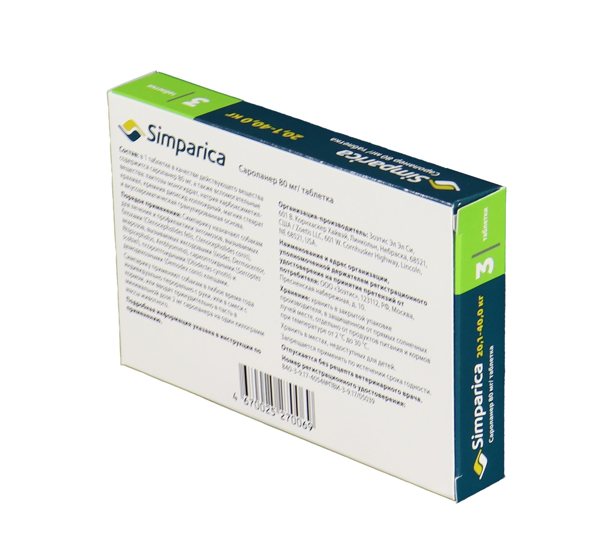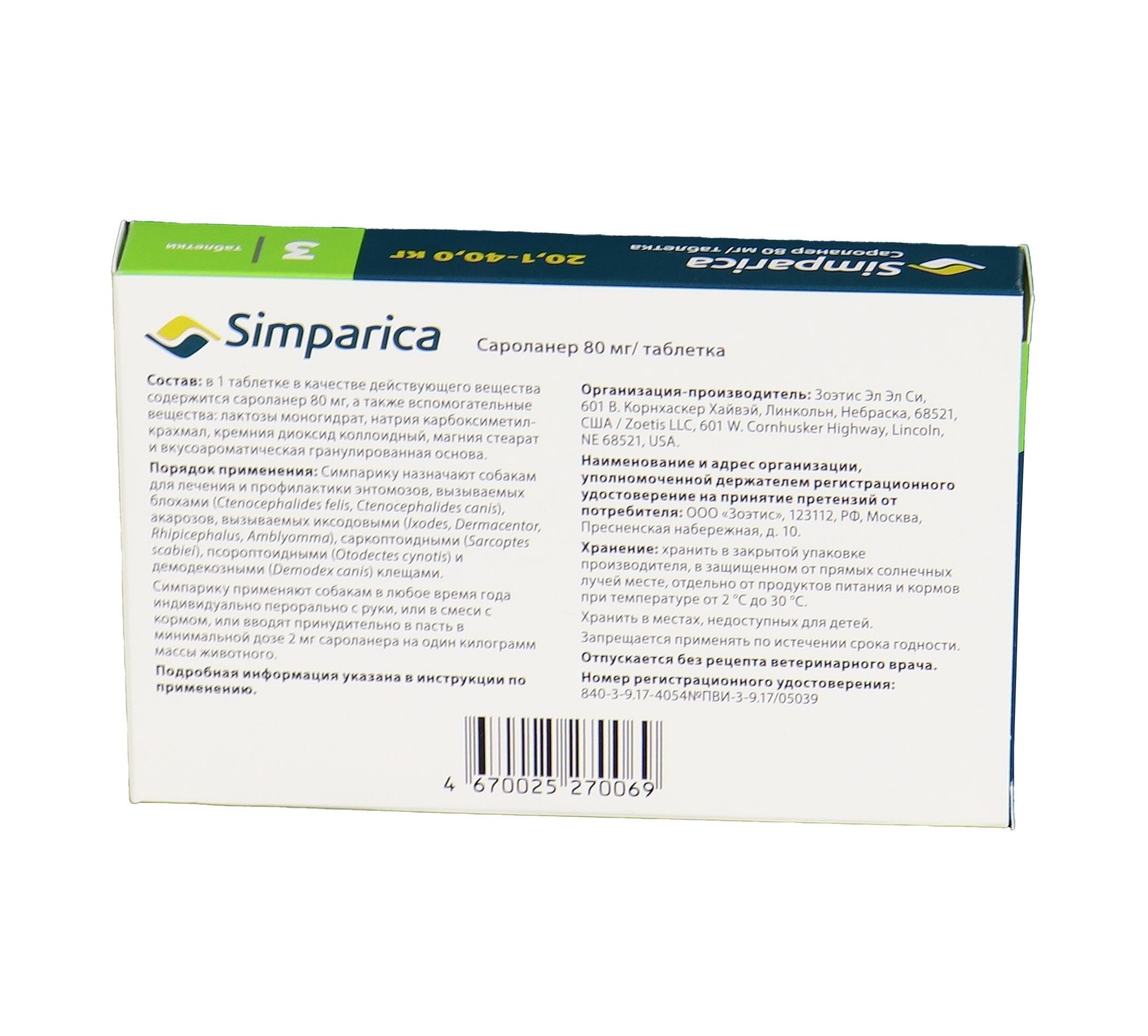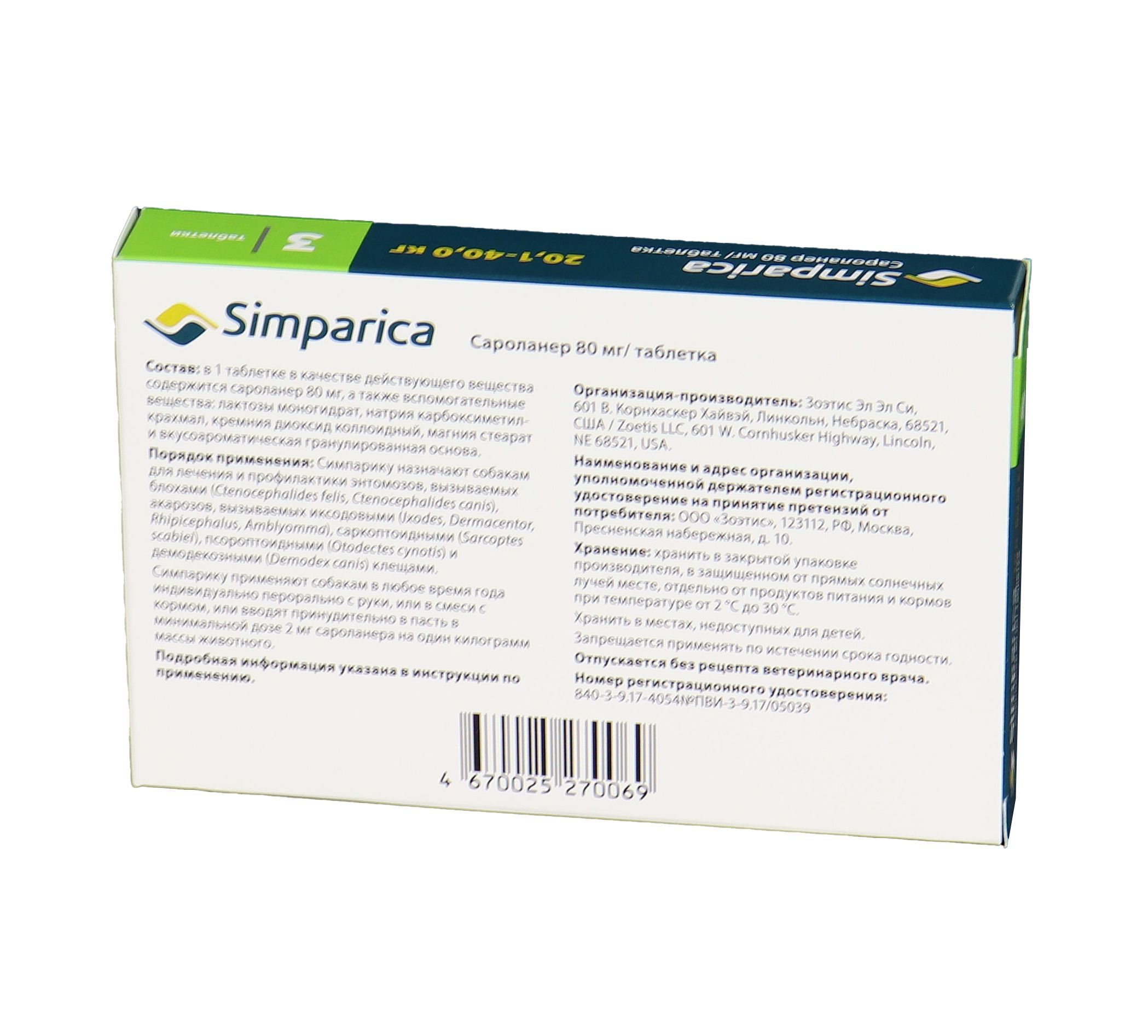 Zoetis Симпарика, жевательные таблетки для собак весом от 20-40кг, 80 мг, 3 таб.