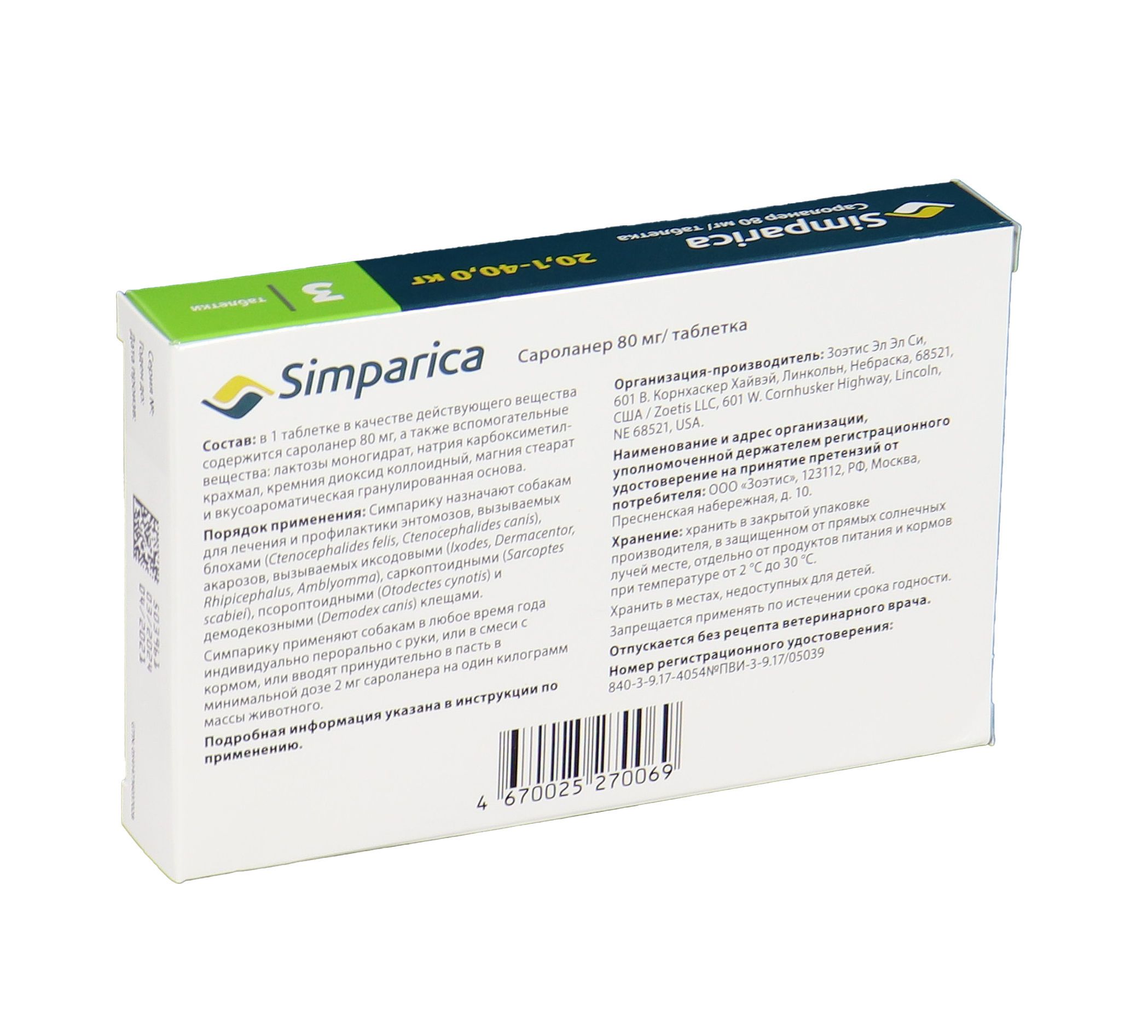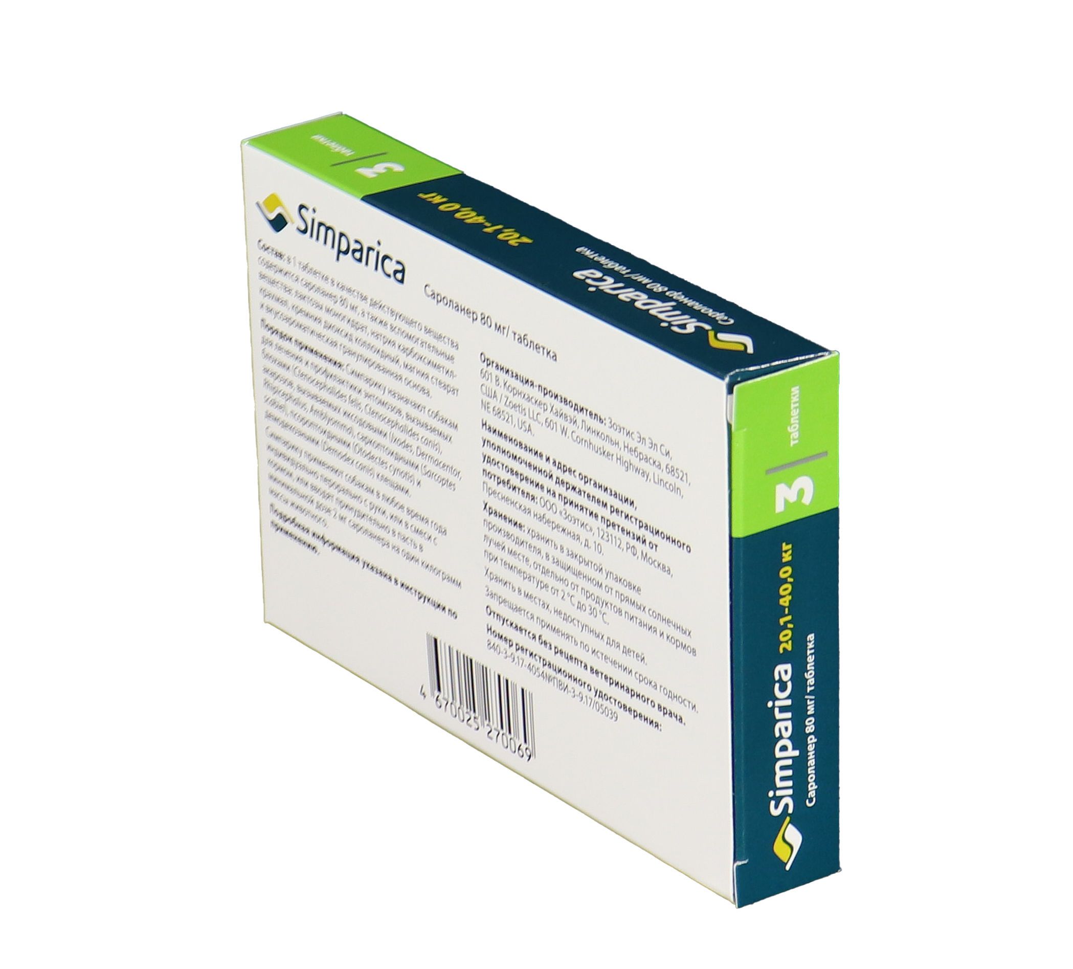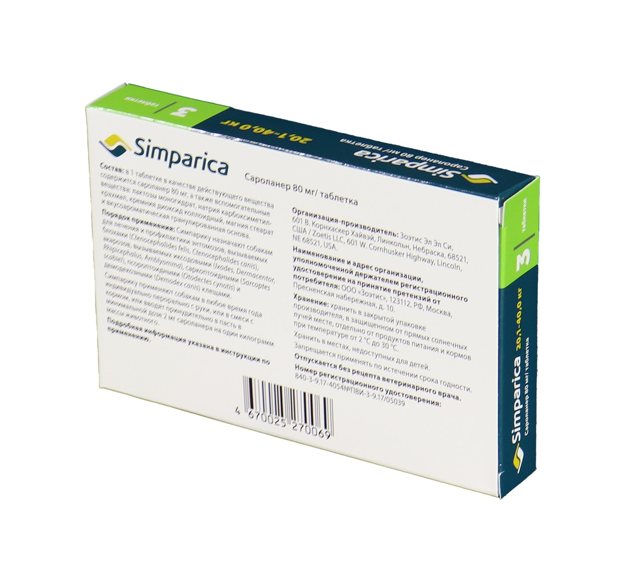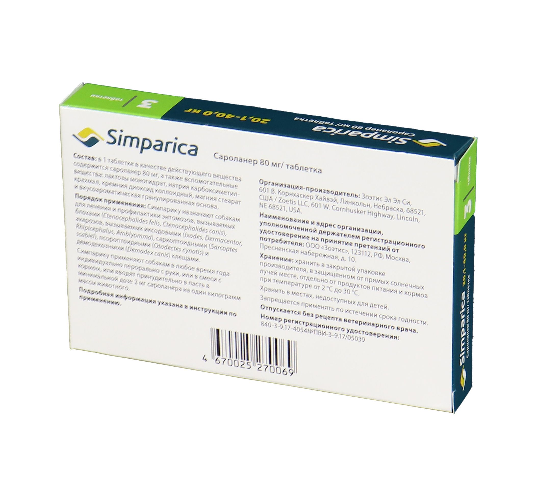 Zoetis Симпарика, жевательные таблетки для собак весом от 20-40кг, 80 мг, 3 таб.