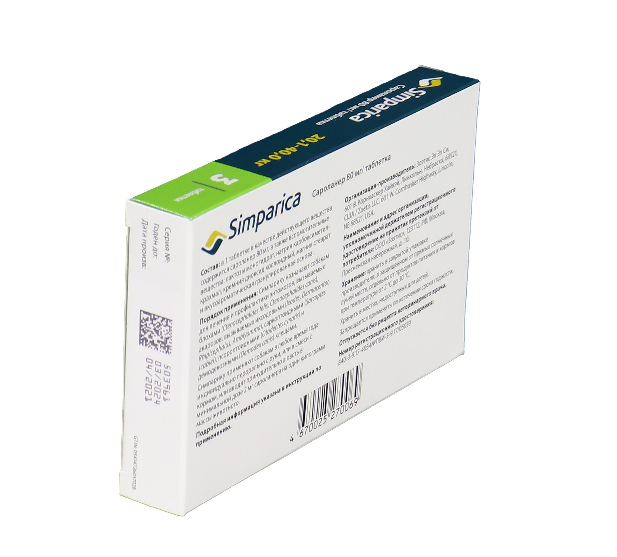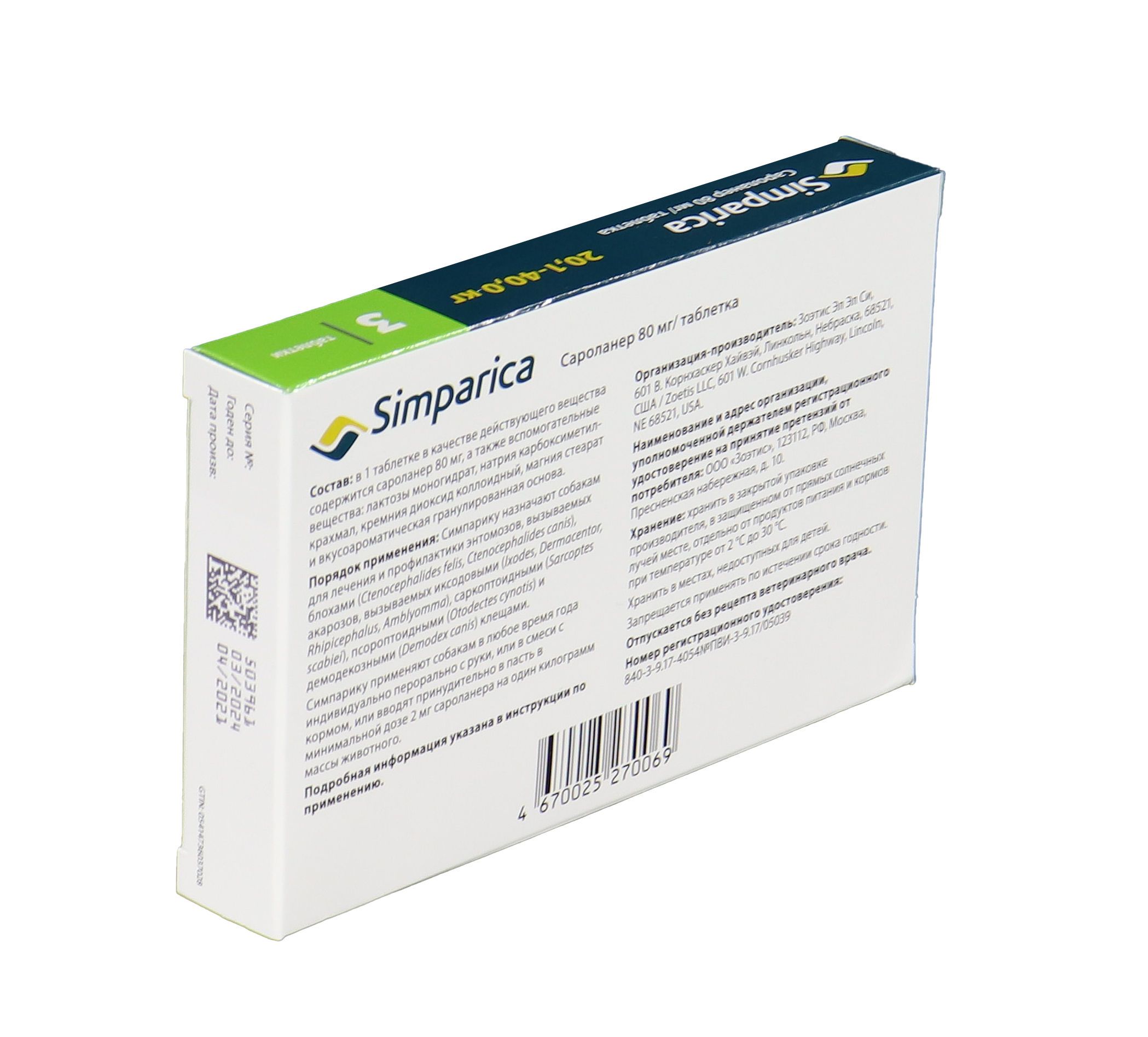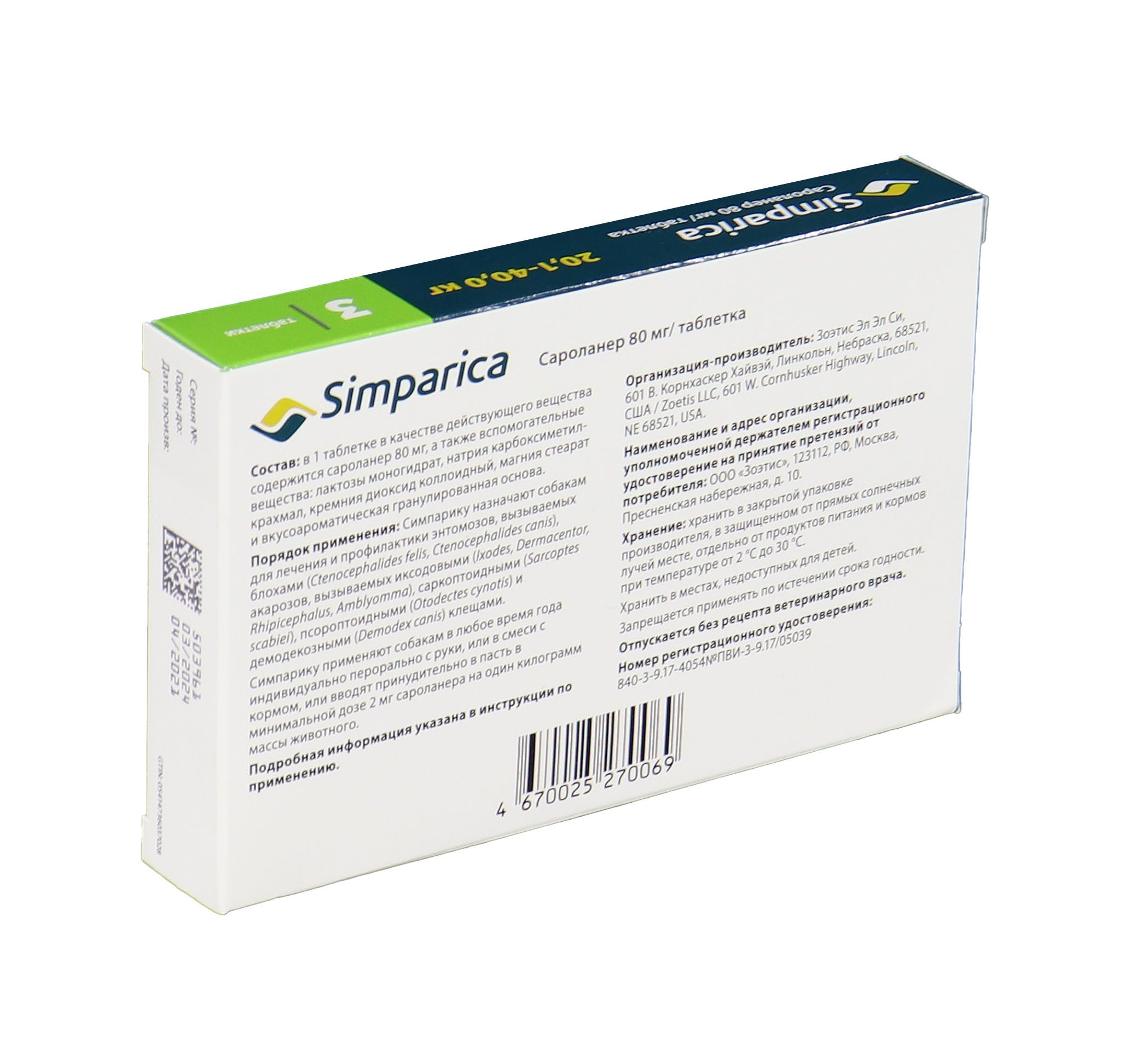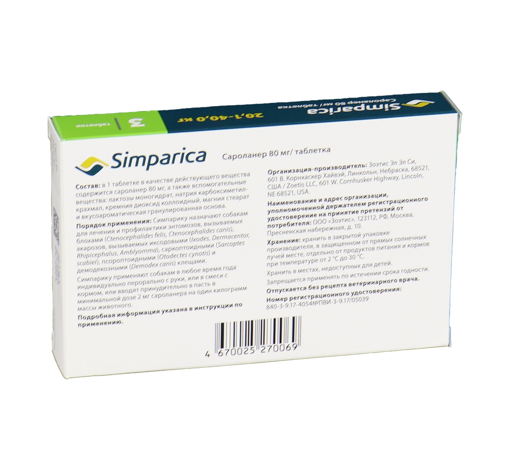 Zoetis Симпарика - жевательные таблетки от блох и клещей для собак весом от 20-40 кг. Уже через 12 часов после дачи таблетки ваша собака будет защищена от 9 видов иксодовых клещей, блох, ушного клеща (отодектоза), чесотки (саркоптоза) и демодекоза. Собака может гулять под дождем, купаться в водоеме и ванне, действие препарата не снижается, и собака остается под надежной защитой! Размер таблетки подобран под размер вашей собаки. Большинство собак едят Симпарику сами. Симпарику удобно давать - В любое удобное для вас время не зависимо от приема пищи.
