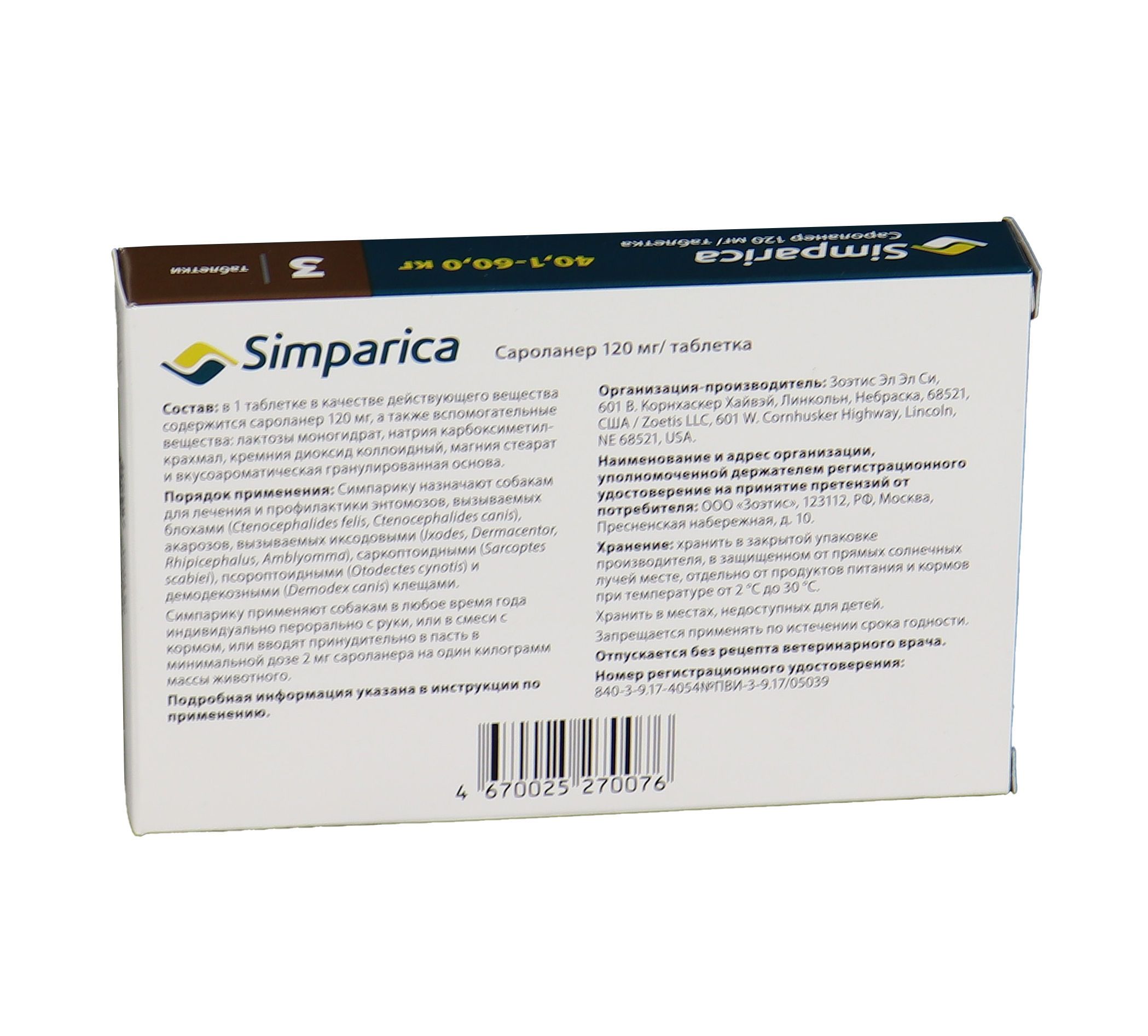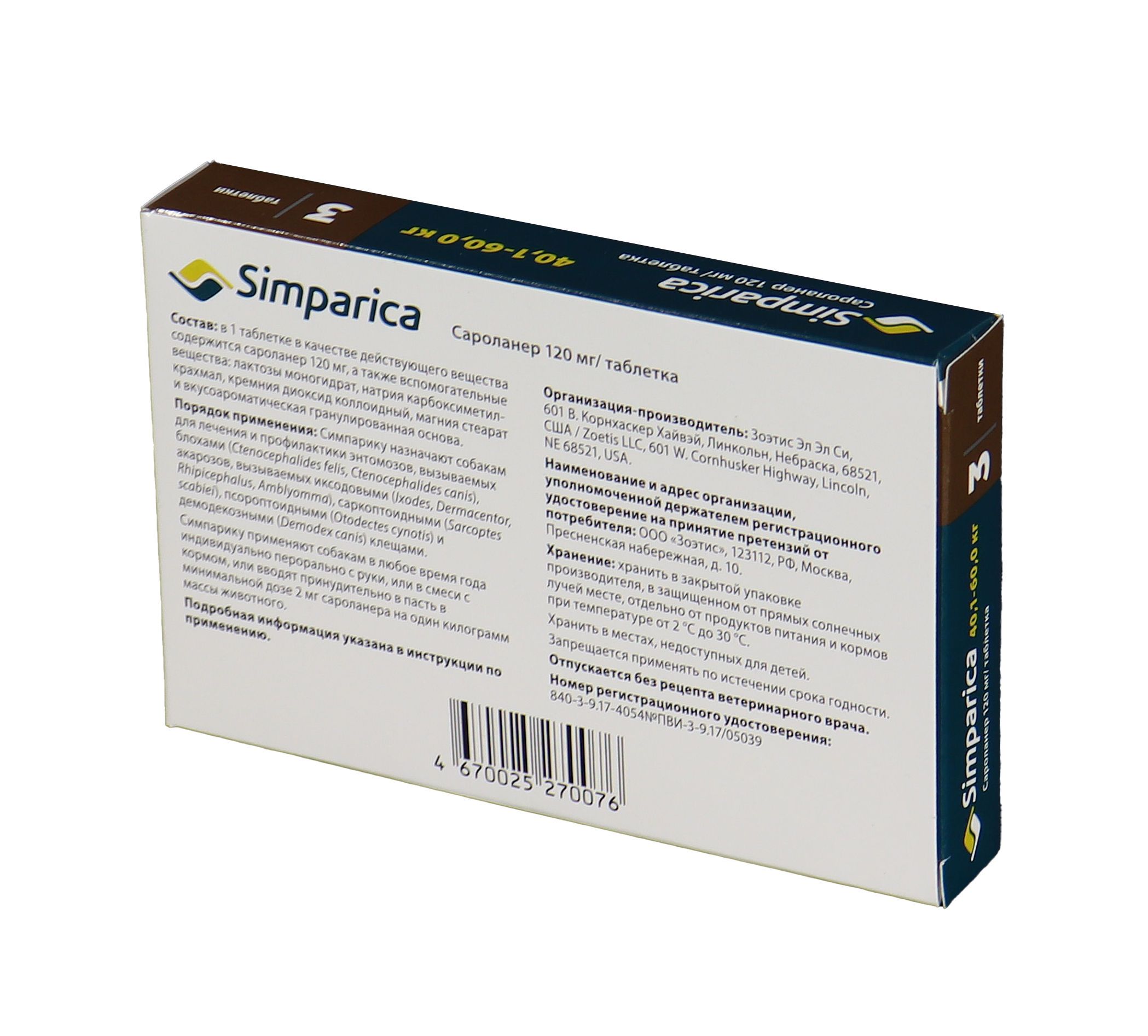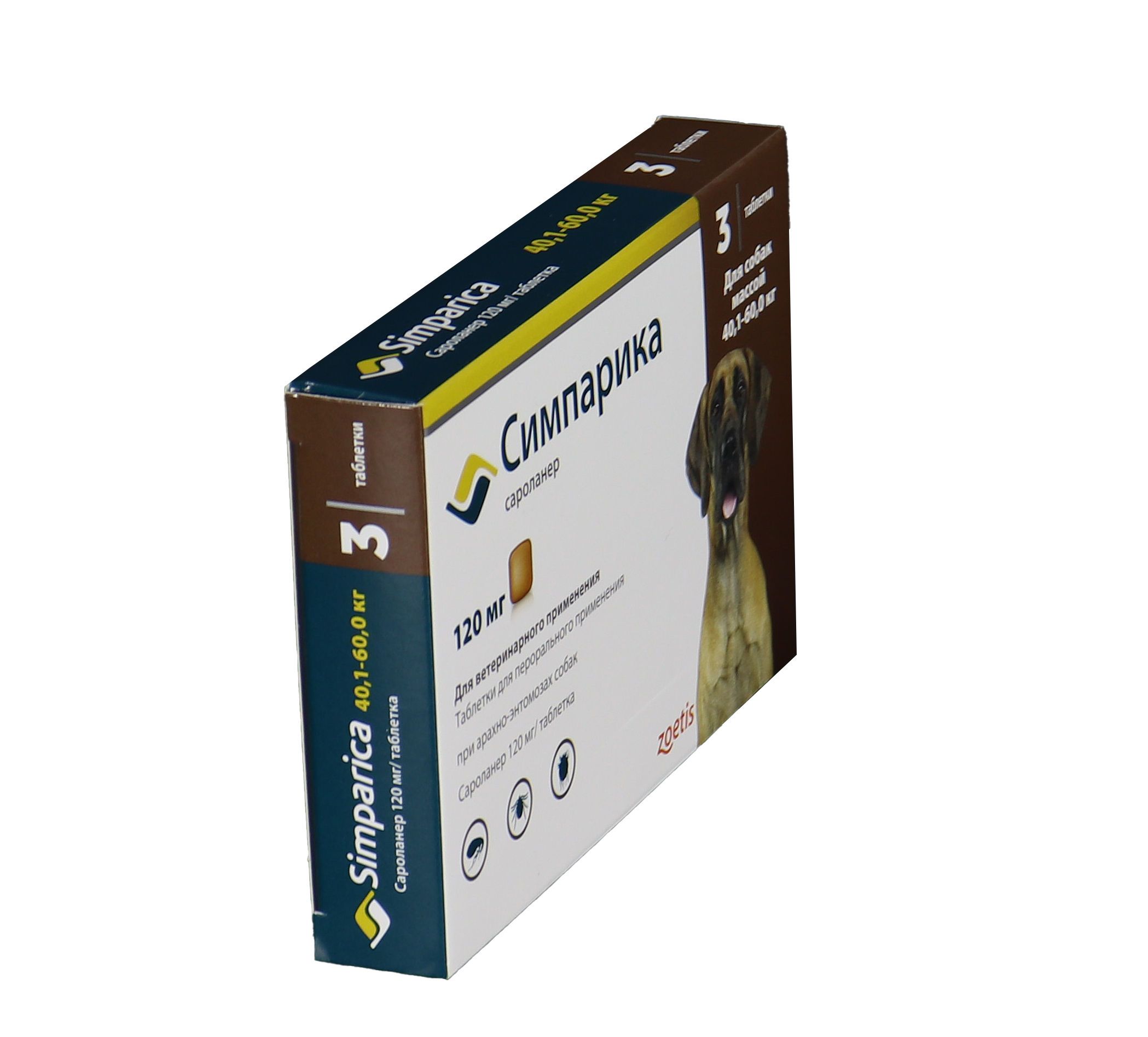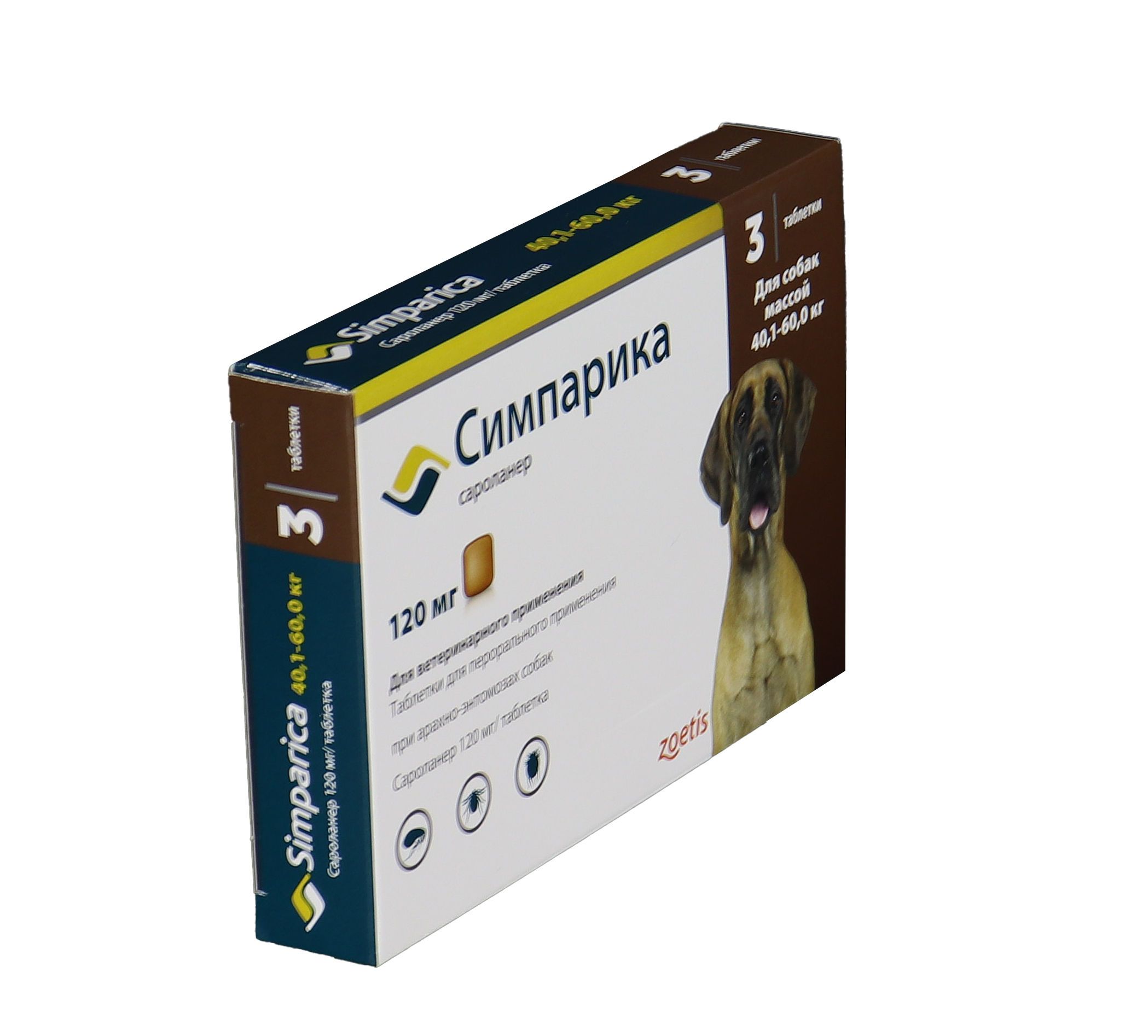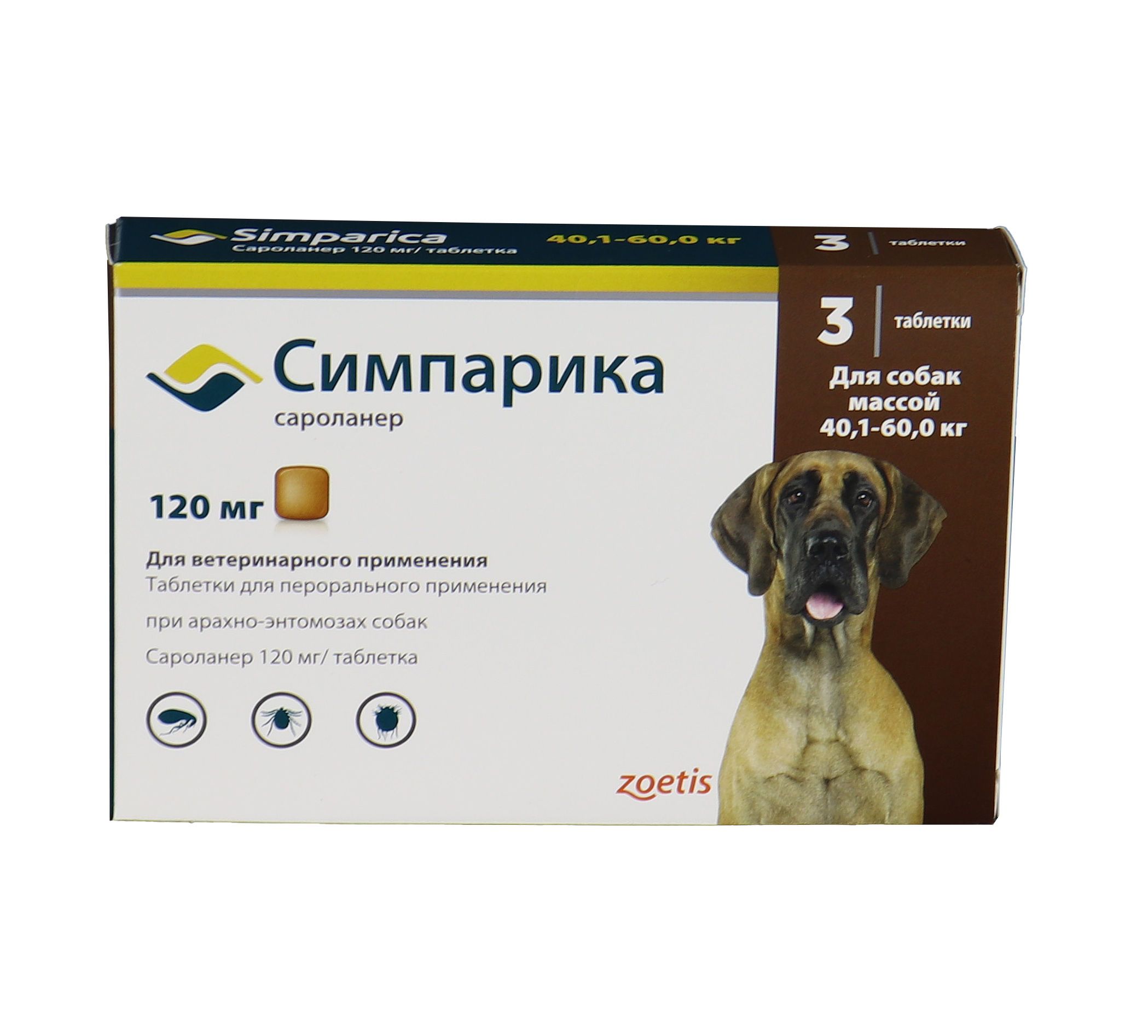 Zoetis Симпарика, жевательные таблетки для собак весом от 40-60кг, 120 мг, 3 таб.