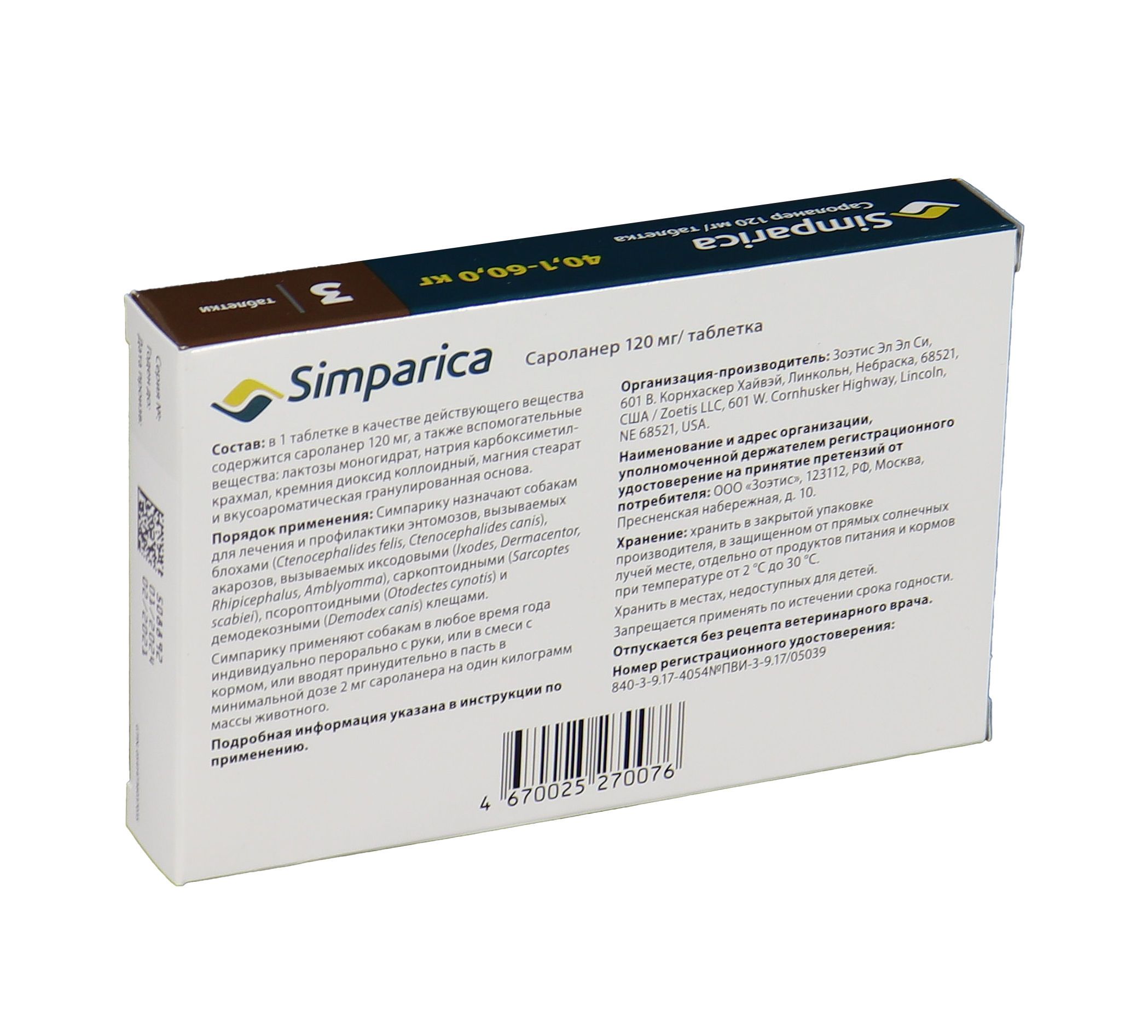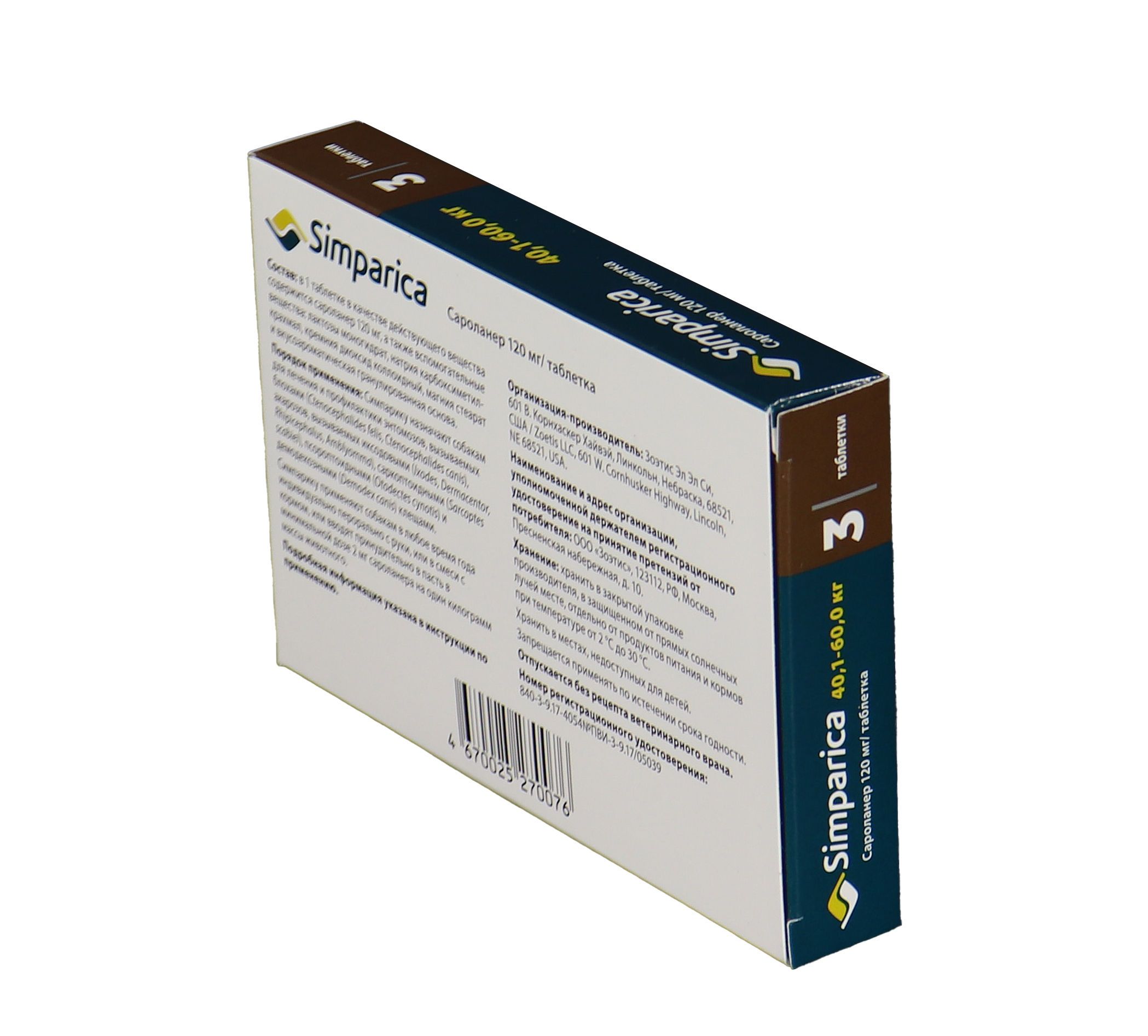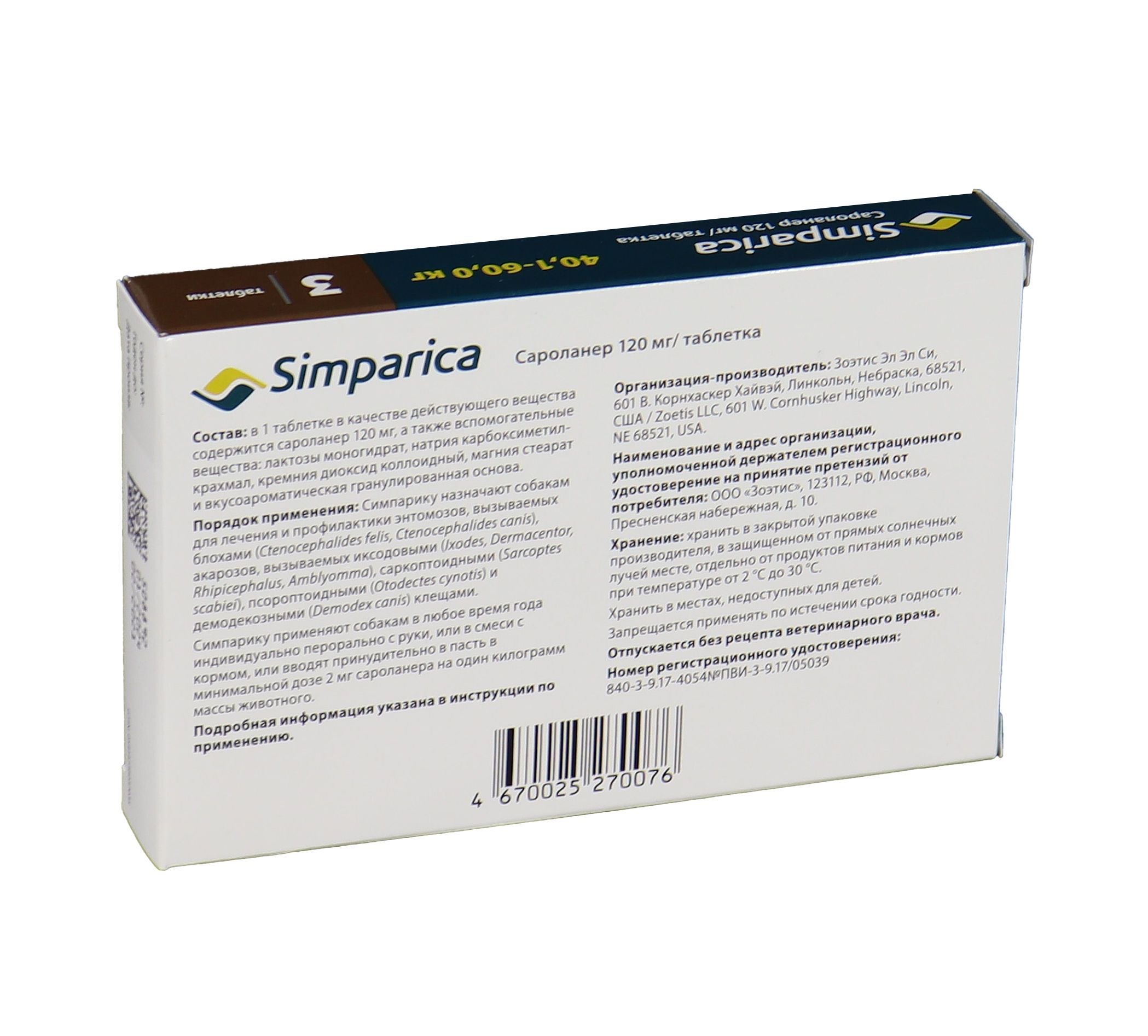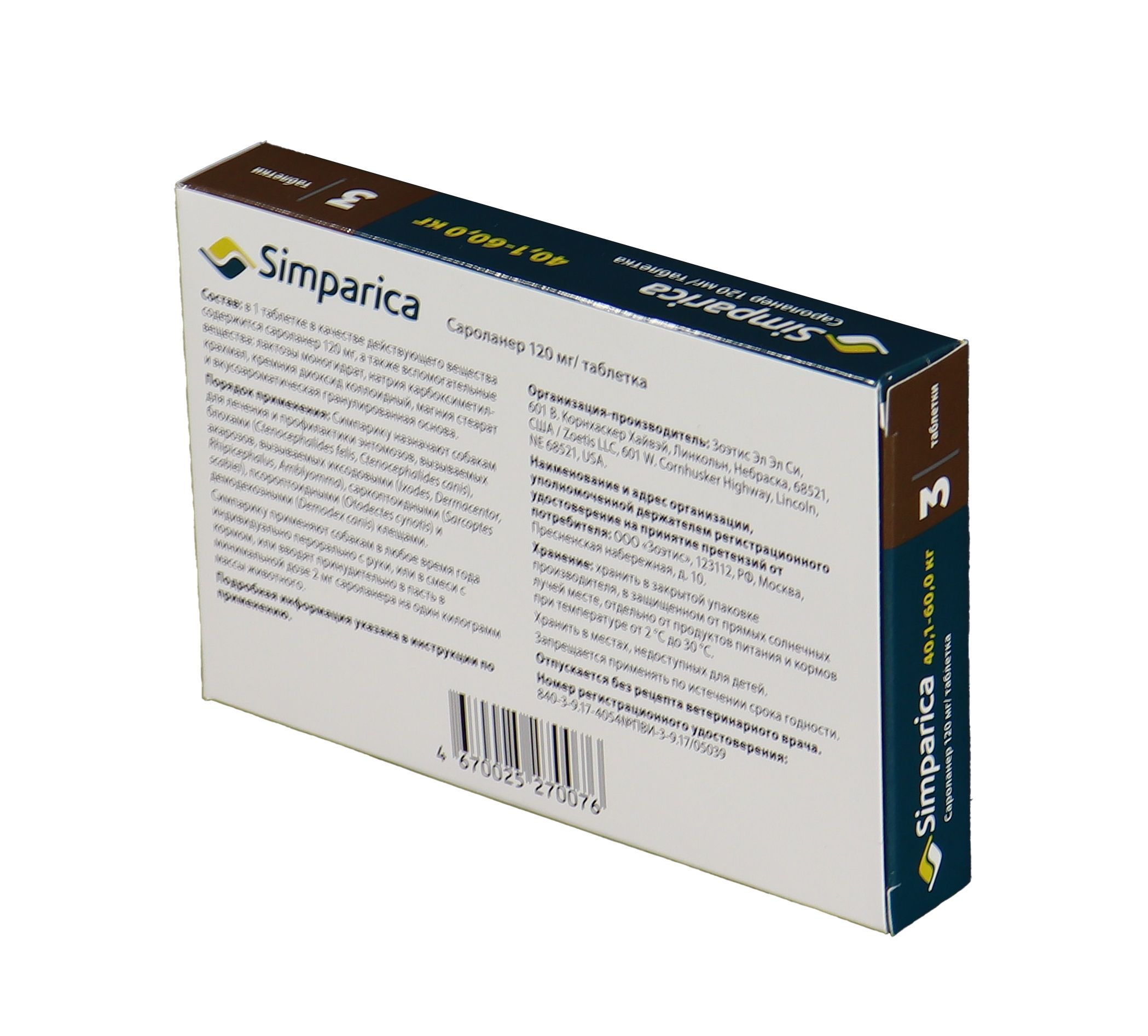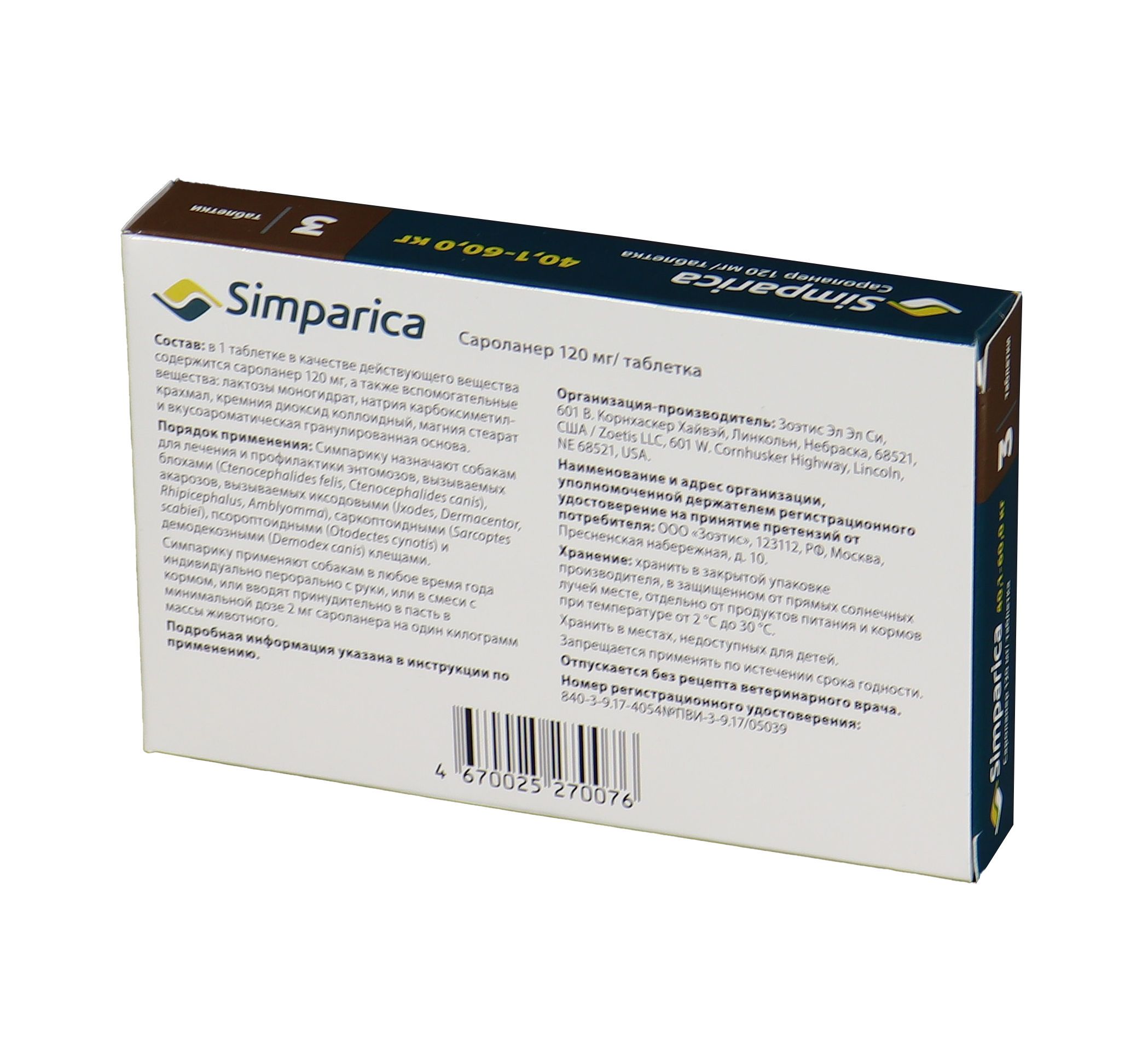 Zoetis Симпарика, жевательные таблетки для собак весом от 40-60кг, 120 мг, 3 таб.