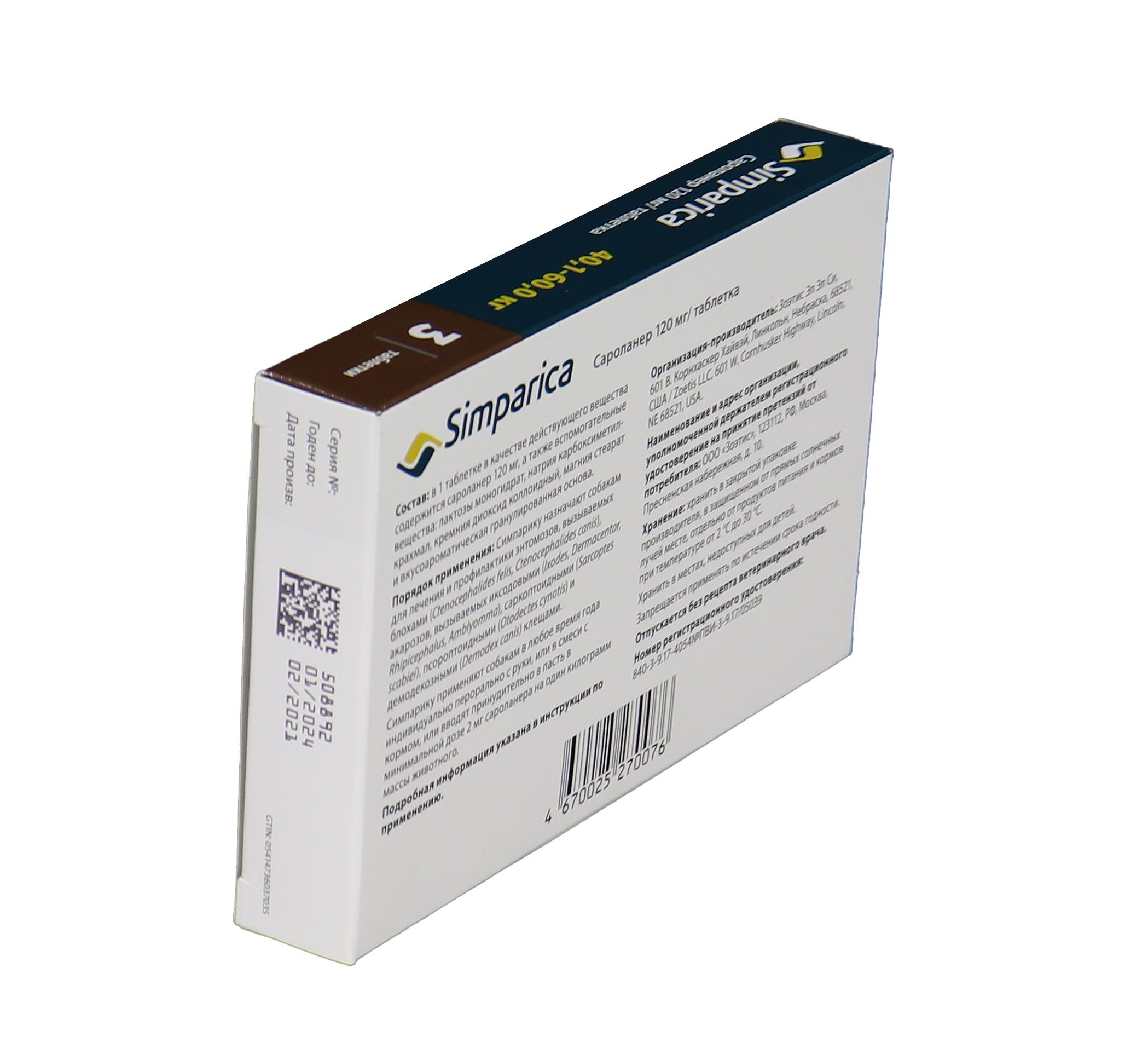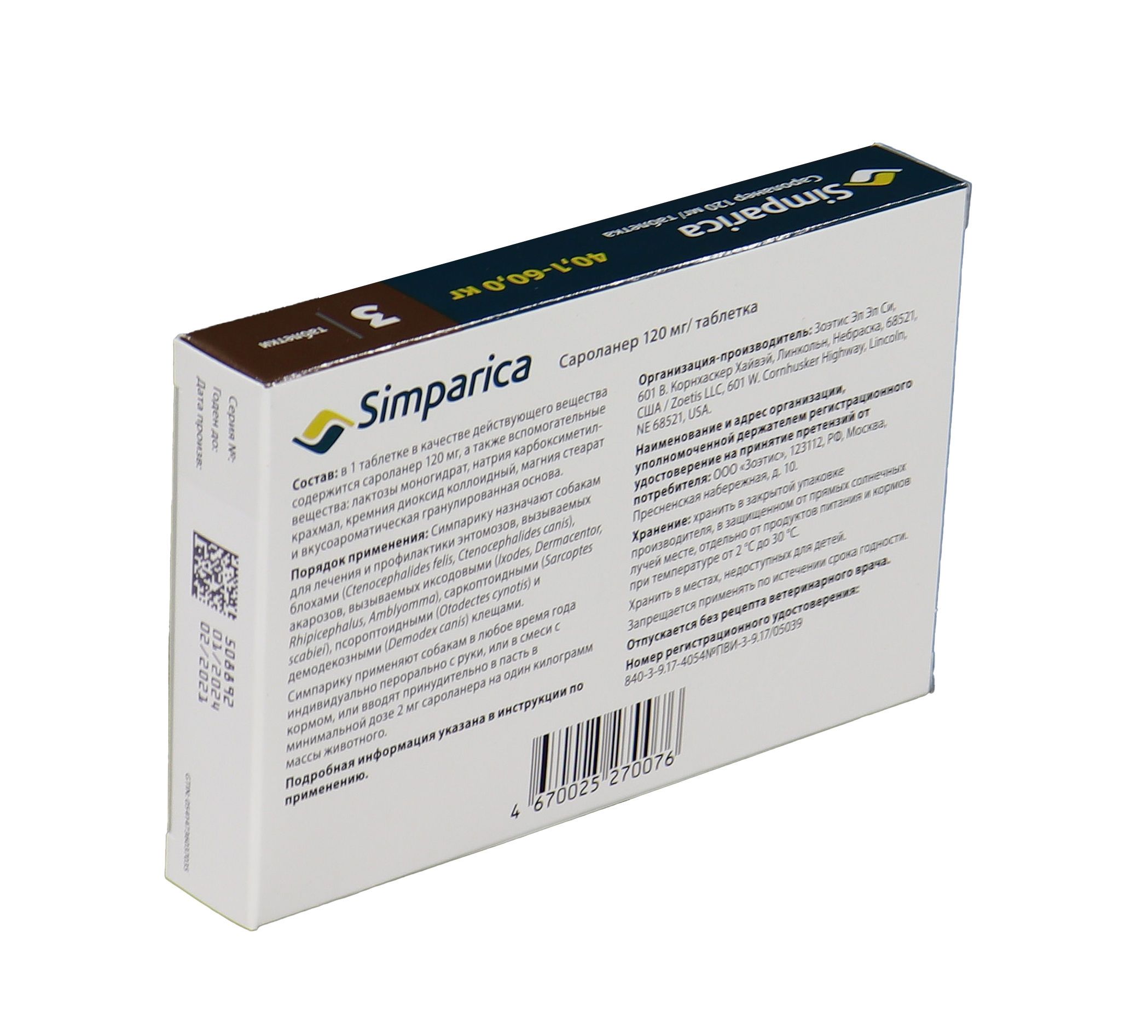 Zoetis Симпарика - жевательные таблетки от блох и клещей для собак весом от 40-60 кг. Уже через 12 часов после дачи таблетки ваша собака будет защищена от 9 видов иксодовых клещей, блох, ушного клеща (отодектоза), чесотки (саркоптоза) и демодекоза. Собака может гулять под дождем, купаться в водоеме и ванне, действие препарата не снижается, и собака остается под надежной защитой! Размер таблетки подобран под размер вашей собаки. Большинство собак едят Симпарику сами. Симпарику удобно давать - В любое удобное для вас время не зависимо от приема пищи.