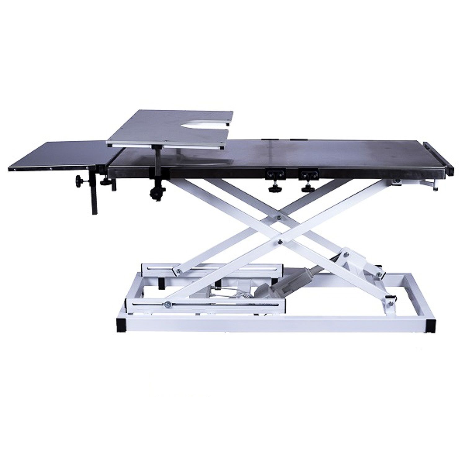 Стол также оснащен дополнительной съемной столешницей из нержавеющей стали, рейлингами, фиксаторами, анестезиологической дугой и штативом для вливаний для удобной и оперативной работы ветеринарного хирурга. Дополнительная съемная столешница позволяет увеличить площадь стола. Дополнительную столешницу можно закрепить в любом месте по периметру стола.